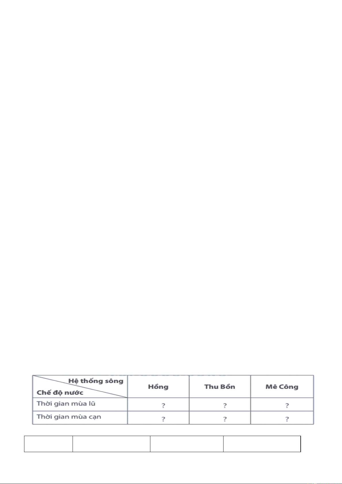 Luyện tập 1 trang 125 Địa Lí 8: Cho biết thời gian mùa lũ, mùa cạn của ba hệ thống sông:
