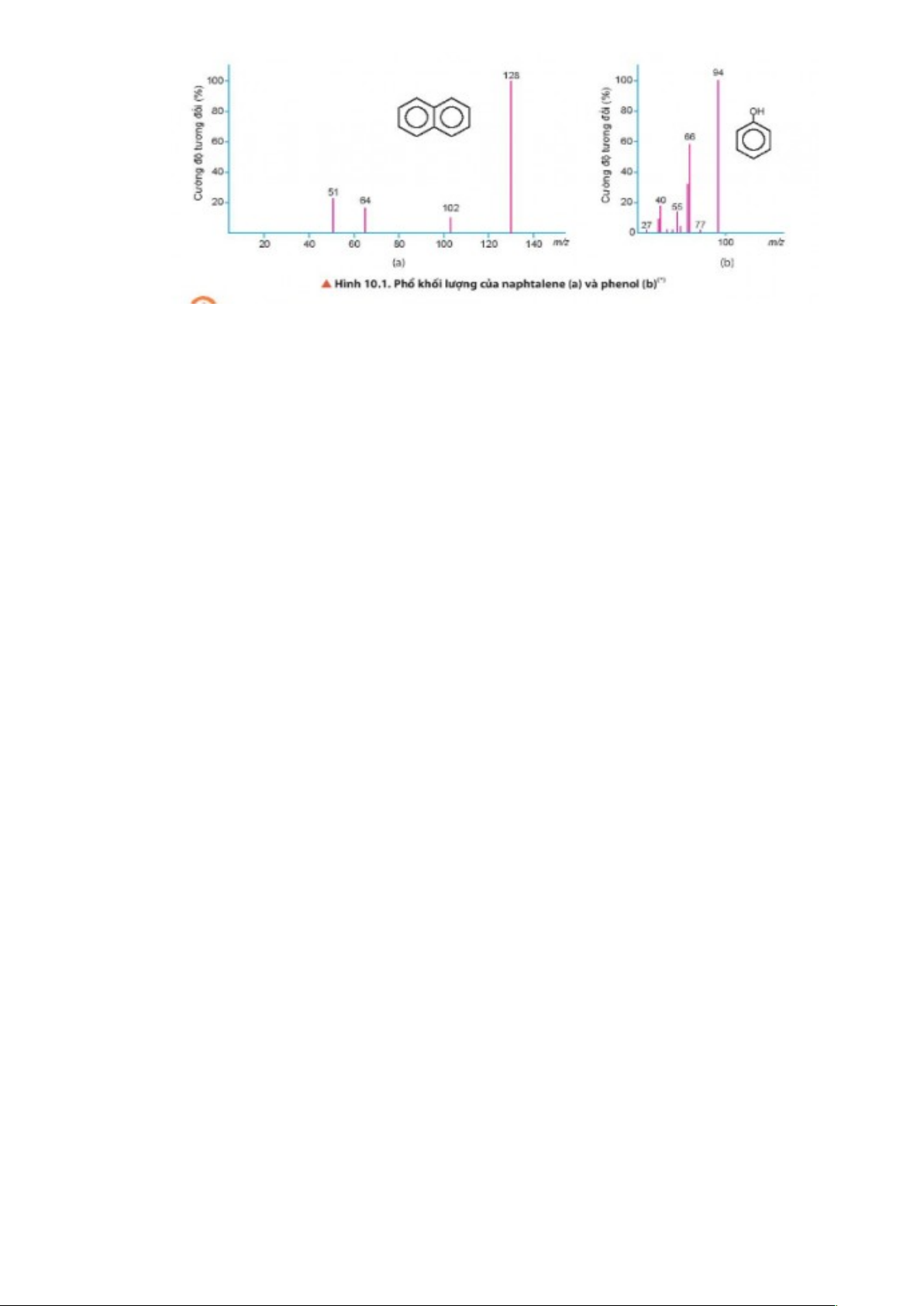 Câu 9. Quan sát hình sau, giá trị phân tử khối của naphtalene và phenol lần lượt là bao nhiêu?. Biết phân tử khối tương ứng với peak có cường độ tương đối lớn nhất hiển thị trên phổ khối lượng.