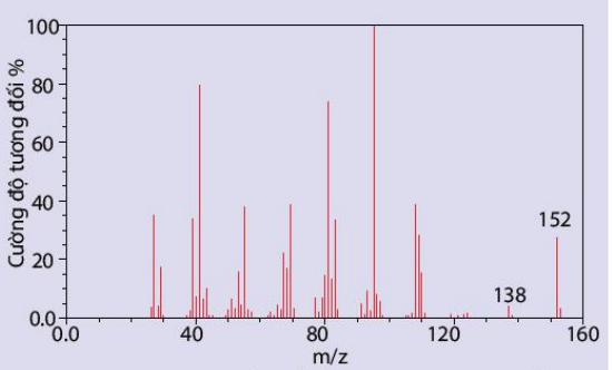 Câu 3: Camphor (có trong cây long não) là 1 chất rắn kết tinh màu trắng hay trong suốt giống như sáp với mùi thơm đặc trưng, thường dùng trong y học. Phần trăm khối lượng các nguyên tố trong camphor lần lượt là : 78,94% C, 10,53% H, 10,53% O và có phổ khối lượng ở hình sau: