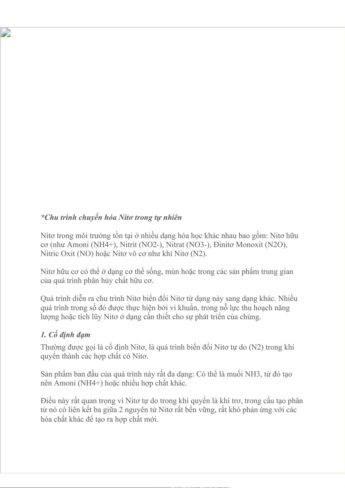 Khi thực vật hoặc động vật chết đi thì dạng ban đầu của Nitơ là chất hữu cơ. Vi