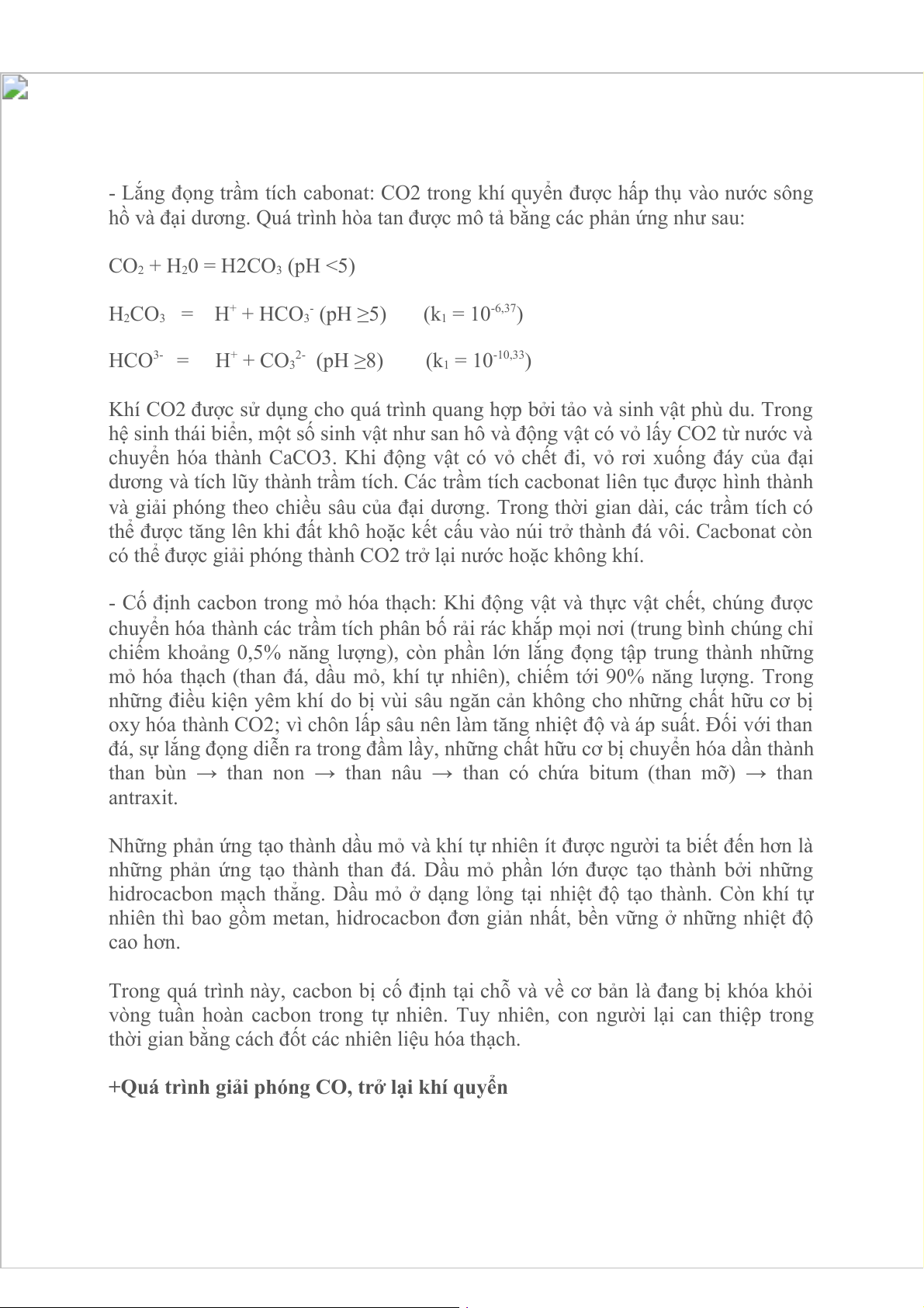 hồ và đại dương. Quá trình hòa tan được mô tả bằng các phản ứng như sau: CO2 + H20 = H2CO3 (pH <5) H + - -6,37