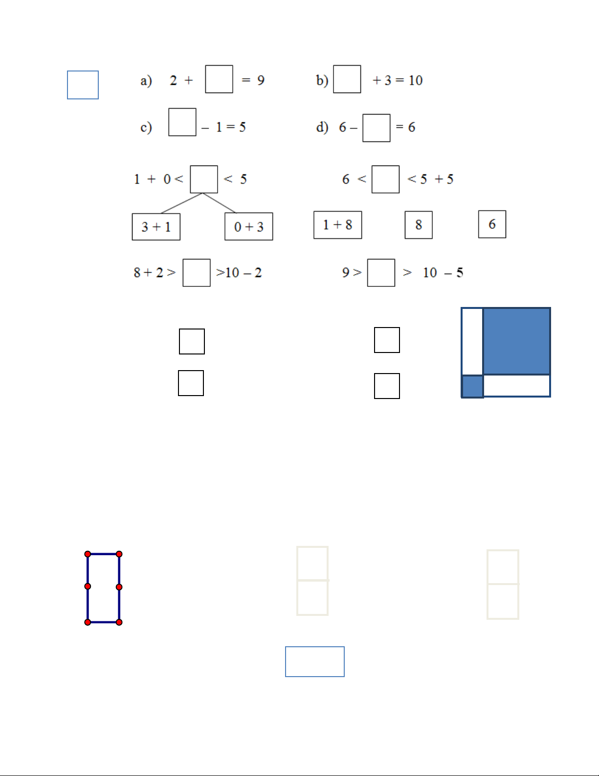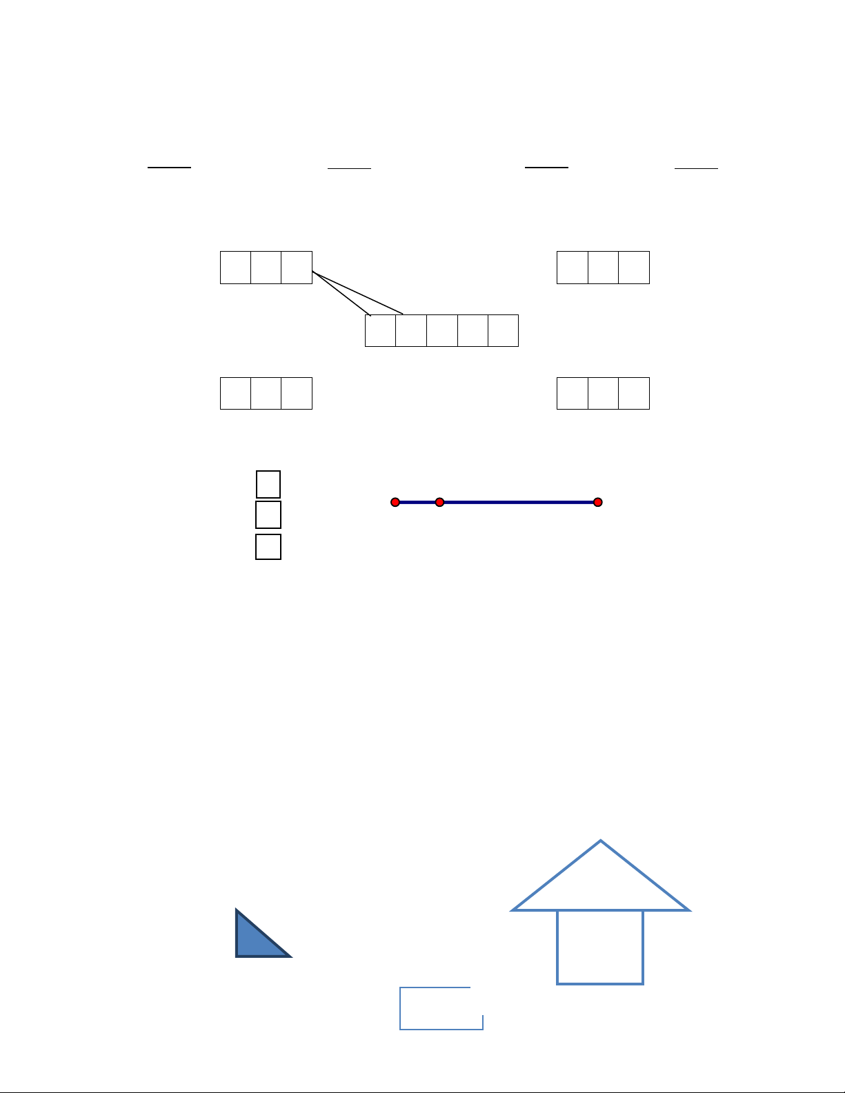 9*. Hãy ghép 8 mảnh gỗ hình tam giác bằng nhau (Hình 1) thành hình ngôi nhà (Hình 2): Hình 1 Hình 2 ĐỀ 3 Trang 17 1. Số ? a) 8 gồm 5 và ….…. b) 6 gồm 1 và ……. c) 10 gồm 3 và ……. d) 9 gồm 7 và ……. 2. > a) 4……..8 b) 4…….7 < ? c) 9……..9 d) 3…….0 = e) 7……..10 g) 6…….6 3. Tính: a) 2 + 8 = …... b) 3 + 4 = …... c) 1 + 7 = …… d) 10 –3 = …… e) 9 – 9 = …… g) 8 – 4 = …… h) i) k) – 8 + 5 – 10 1 3 2 …… …… ……… 4. Nối (theo mẫu): Trang 18 5. Số: + 0 - 7 a) 9 b) + 7 - 9 2 c) - 6 + 3 10 6. > a) 9 - 1………2 + 7 b) 1 + 3 + 1…….5 + 0 < ? = c) 0 + 6……...10 - 2 e) 9 + 1 - 3…….4 + 2