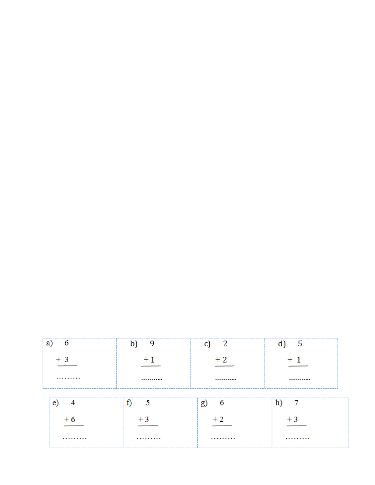 CHỦ ĐỀ 3: PHÉP TÍNH 1. Số a) 2 + 8 = ………. b) 1 + 4 = ………… c) 4 + 4 = ……… d) 3 + 7 = ……….. e) 5 + 0 = ………… g) 4 + 3 = …….. h) 5 + 5 = ………... i) 2 + 5 = ………… k) 3 + 3 = ……… l) 4 + 0 = ………… m) 8 + 0 = ………. n) 6 + 2 = ……… 2. Tính: 3. số: Trang 5 a) 7 - 0 =……… b) 5 - 3 = ……… c) 6 - 1 = ……….. d) 9 - 3 = …….. e) 8 - 8 = ……… g) 6 - 0 = ……….. h) 7 - 5 = …….. i) 9 - 6 = ………. k) 8 - 7 = ……….. i) 10 - 3 = …….. m) 10 - 8 = ……. n) 9 - 9 = ……….. 4. Tính: a) 7 b) 6 c) 8 d) 9 - 6 - 4 - 3 - 7 ……… ……… ……… ……… e) 7 g) 5 h) 8 1) 10 - 2 - 4 - 6 - 7 ……… ……… ……… ……… 5. Số: a) + 2 - 7 6 - 3 + 2 b) 10 + 5 - 9 c) 4 Trang 6
