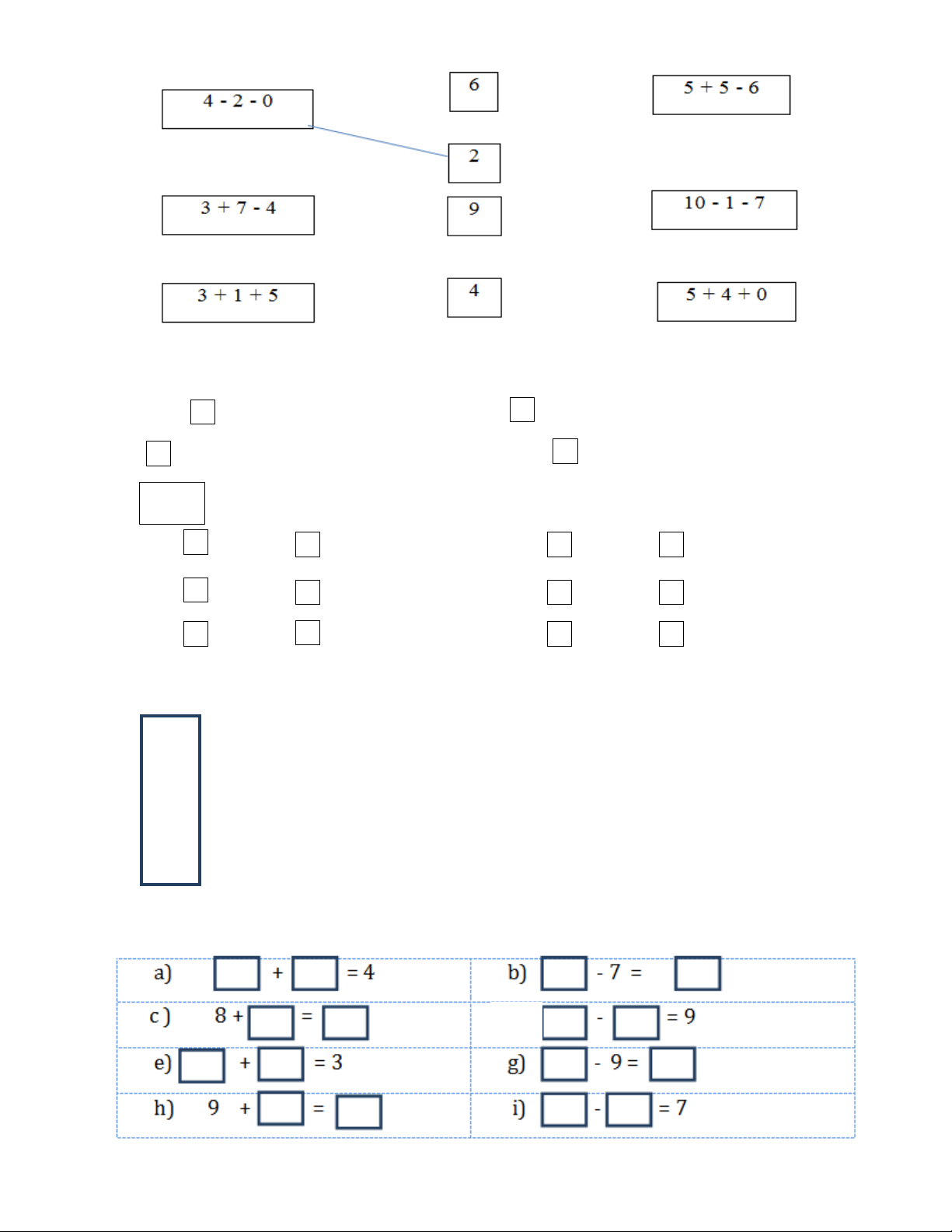 6. Nối ( theo mẫu): 7. Số? a) 3 - = 3 b) + 2 = 10 c) + 1 = 8 d) 10 - = 4 8*. +; - a) 7 4 = 2 1 d) 8 4 = 2 2 b) 5 4 = 2 1 e) 4 4 = 7 7 c) 9 2 = 1 6 g) 9 6 = 6 3 9 . a) 8 - 3………2 + 4 b) 1 + 3 + 3 ………5 + 4 > c) 0 + 7……..10 - 3 e) 9 + 1 - 3……….5 + 5 < e) 9 - 2 ……..4 + 3