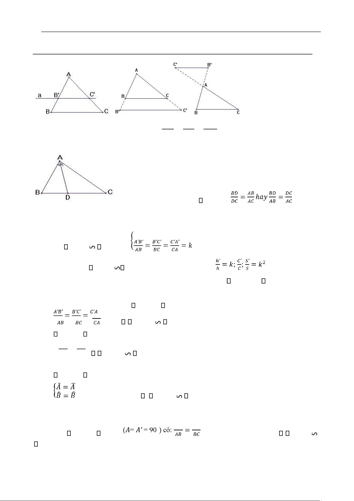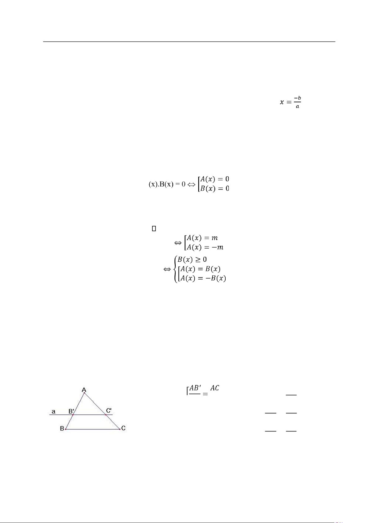 1. Định lý Ta-lét thuận và đảo:  ′  ′   𝐴𝐵  𝐴𝐶  𝛥𝐴𝐵𝐶  𝐴𝐵 ′ 𝐴𝐶  {    𝑎 / / 𝐵𝐶 ⇔  =   𝐵𝐵  𝐶𝐶 ′  ′  ′   𝐵𝐵 ′  𝐶𝐶  [  =  𝐴𝐵  𝐴𝐶