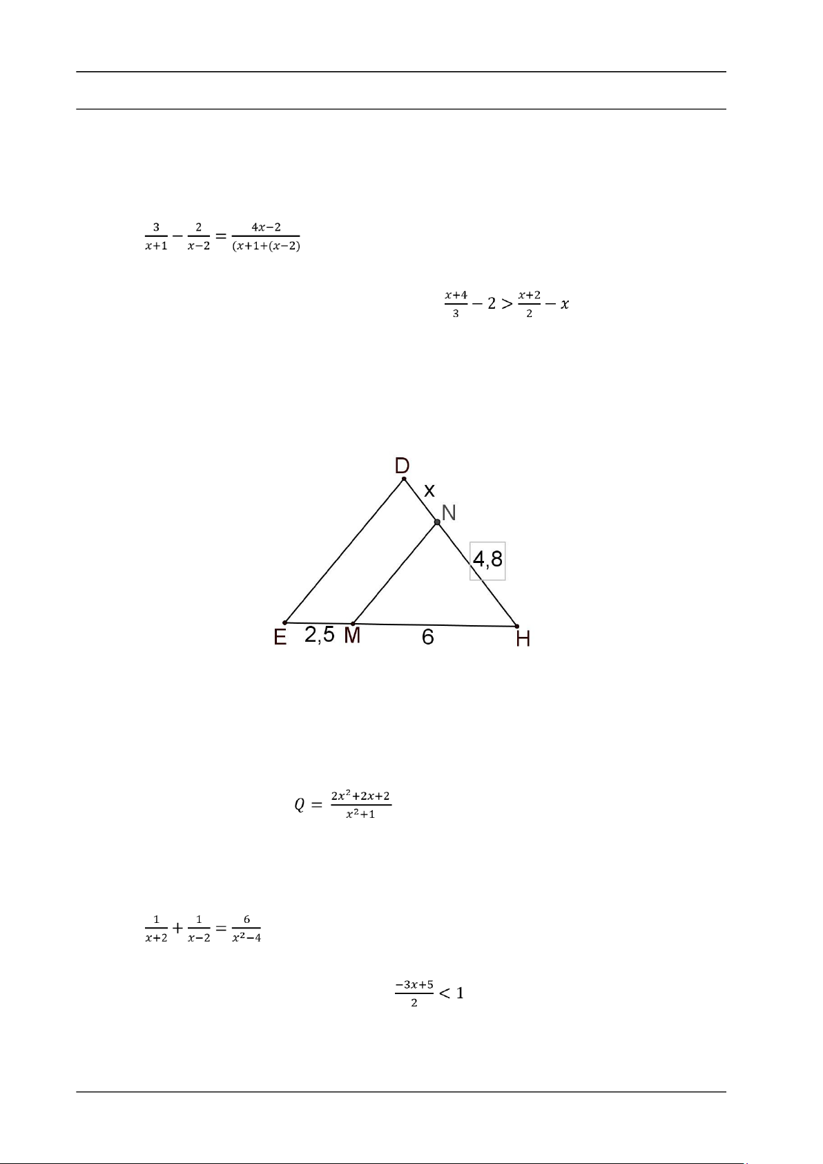 điểm). Tính độ dài x trong hình vẽ sau, biết MN // DE, HN = 4,8cm, HM = 6cm, ME = 2,5cm.