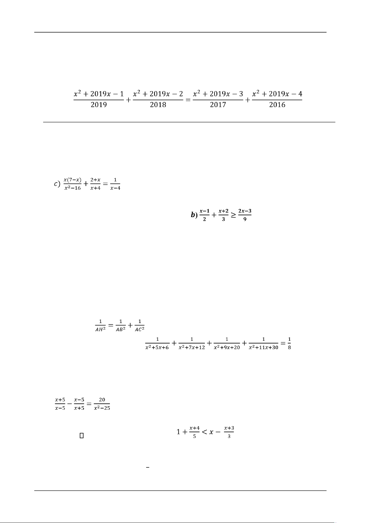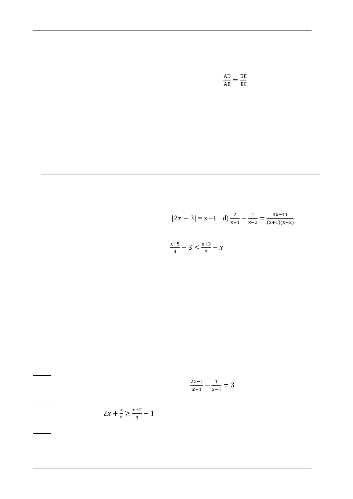Bài 1 (3 điểm). Giải các phương trình sau:    a) 2𝑥 −3 = 5;  b) (𝑥 +2)(3𝑥–15) = 0;    c)  ;  d) |2𝑥 −1| = 14−𝑥.