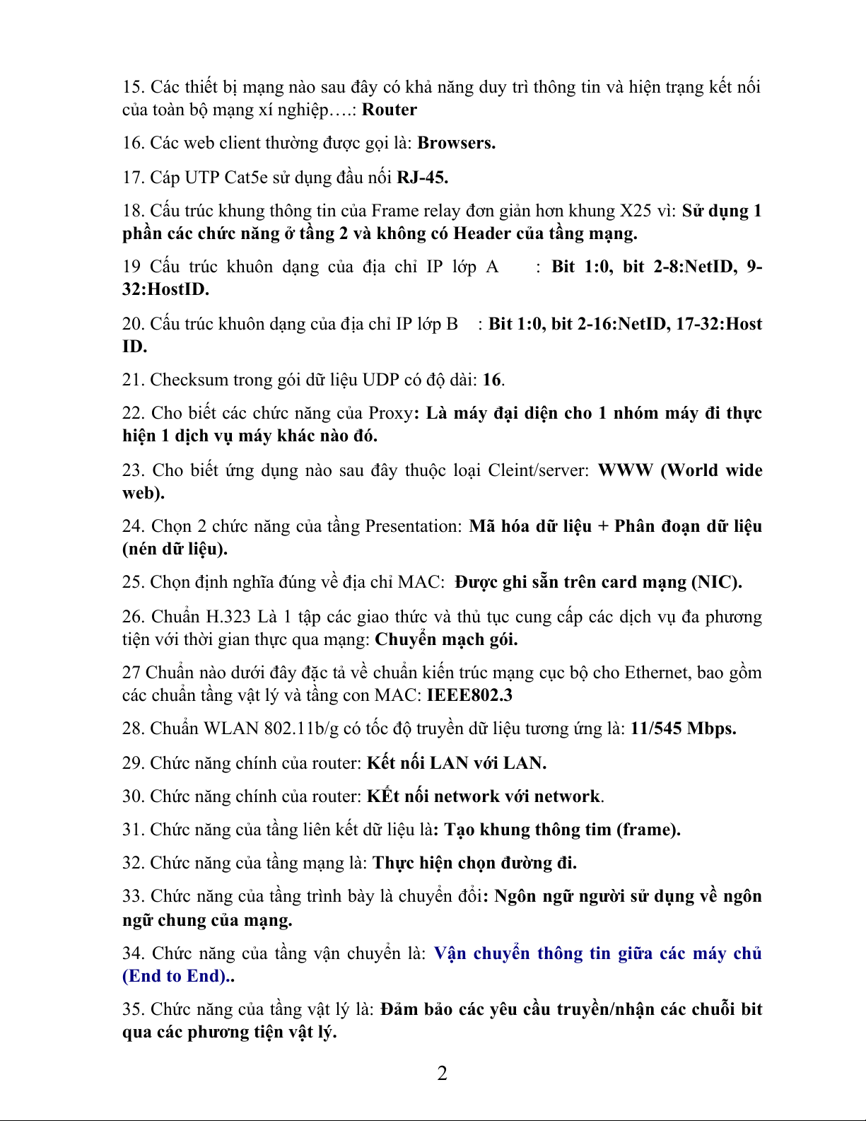 34. Chức năng của tầng vận chuyển là: Vận chuyển thông tin giữa các máy chủ (End to End)..
