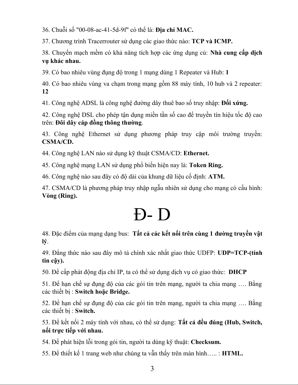 47. CSMA/CD là phương pháp truy nhập ngẫu nhiên sử dụng cho mạng có cấu hình: Vòng (Ring). Đ- D