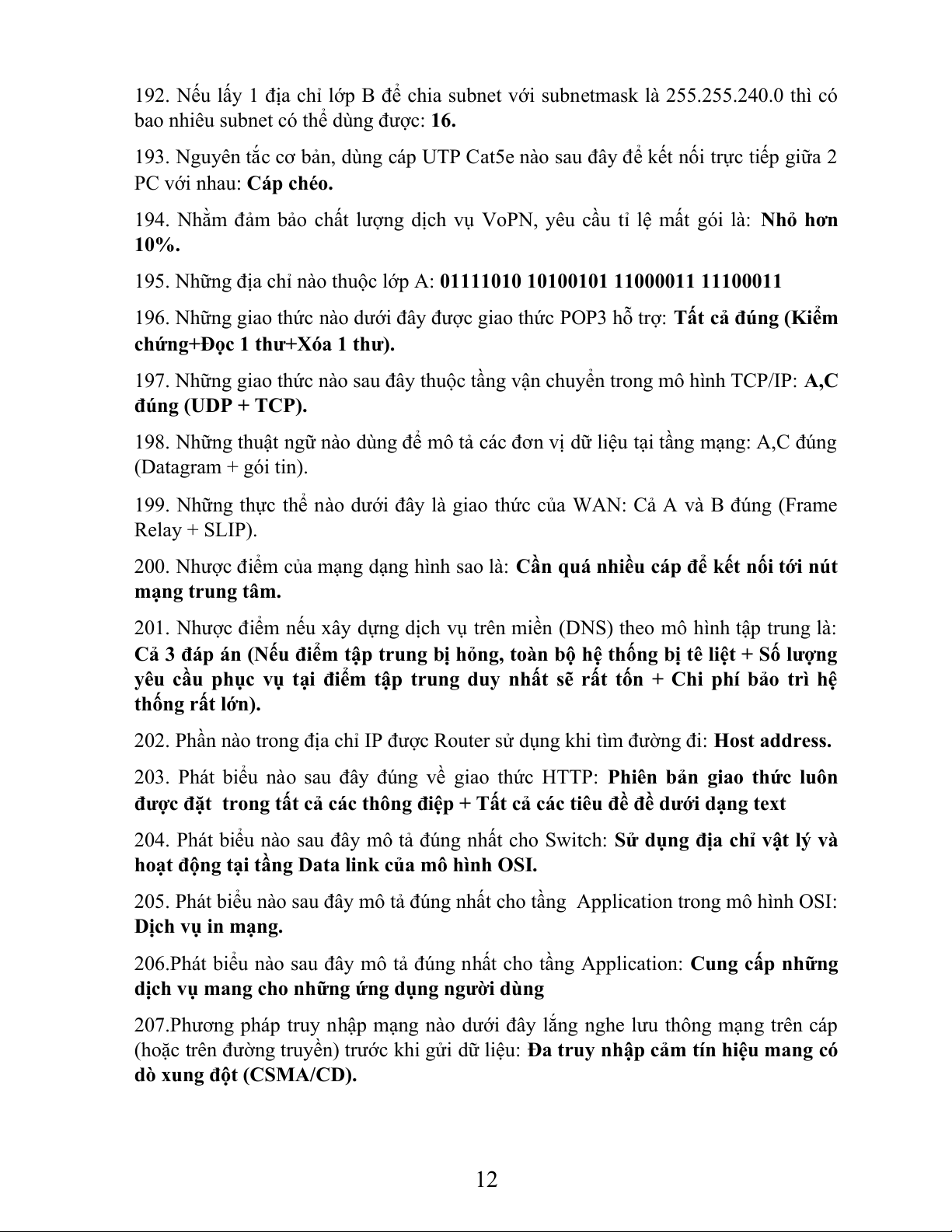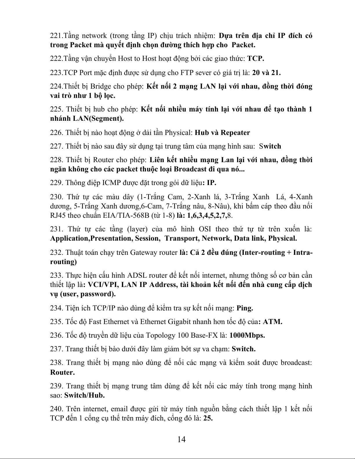 225. Thiết bị hub cho phép: Kết nối nhiều máy tính lại với nhau để tạo thành 1 nhánh LAN(Segment).