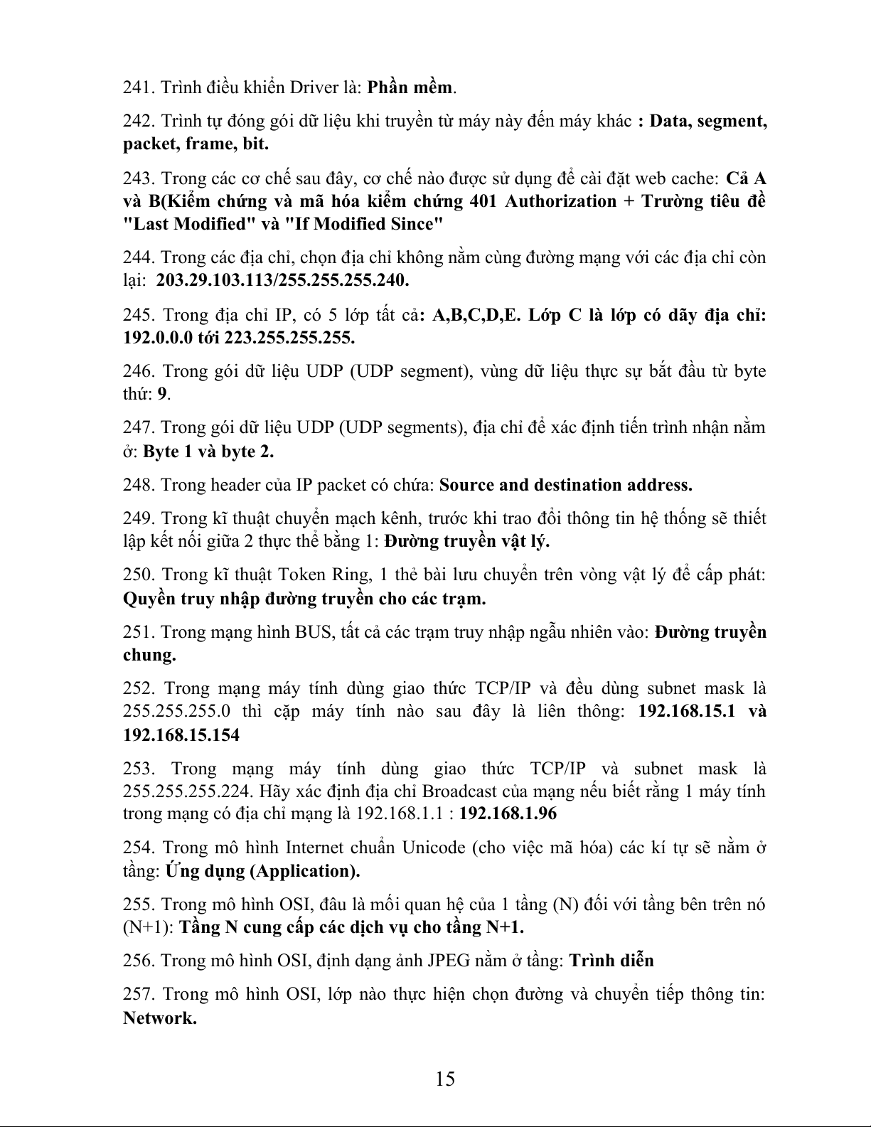 257. Trong mô hình OSI, lớp nào thực hiện chọn đường và chuyển tiếp thông tin: Network. 15