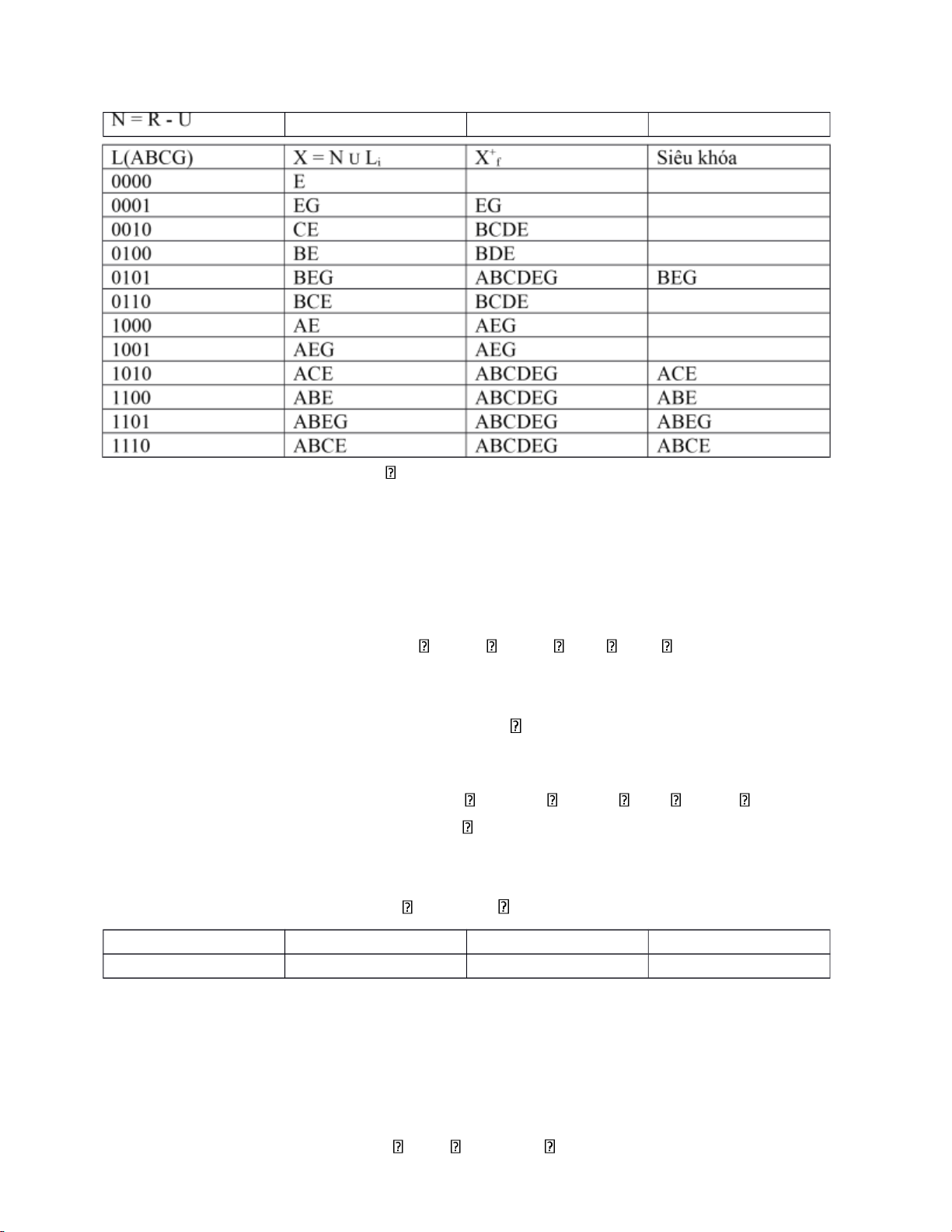 N = R - Uright = CD, D = R - Uleft = , L = Uright Uleft = ABE X = N U L i X + f Siêu khóa 000 CD CD 001 CDE ABCDE CDE 010 BCD ABCDE BCD 100 ACD ABCD 101 ACDE ABCDE ACDE 110 ABCD ABCDE ABCD 111 ABCDE ABCDE ABCDE L(ABE) Bài tập 10.