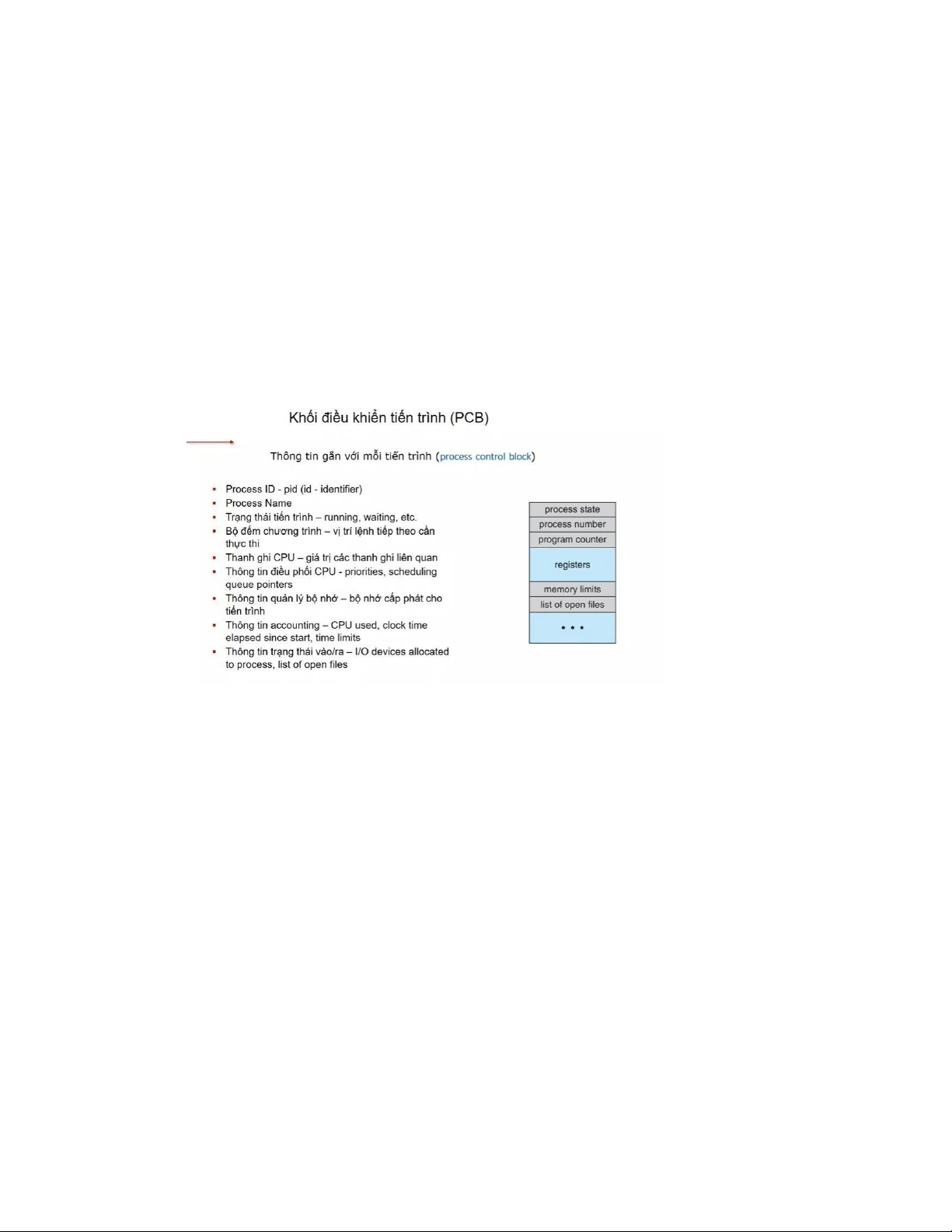 - Mỗi tiến trình bao gồm: một không gian địa chỉ, một tập thanh ghi, một con trỏ lệnh, một stack riêng