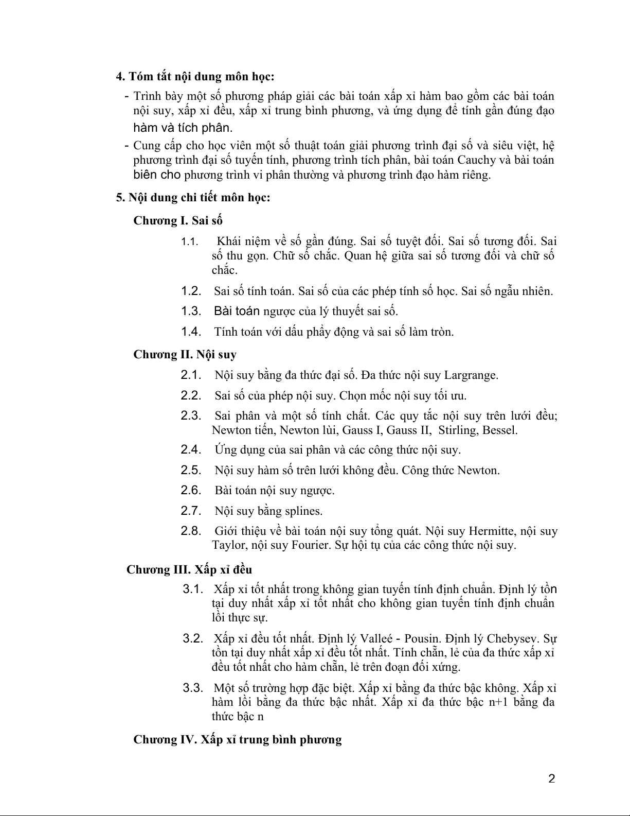 - Cung cấp cho học viên một số thuật toán giải phương trình đại số và siêu việt, hệ