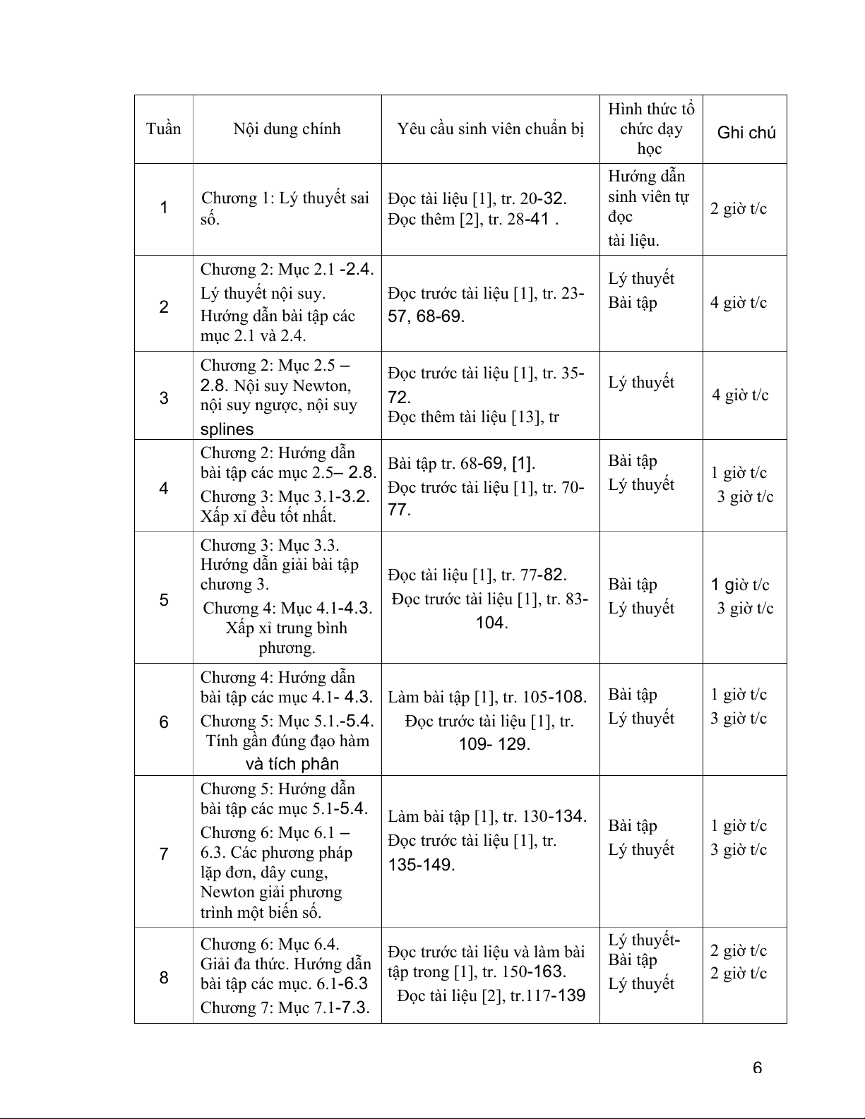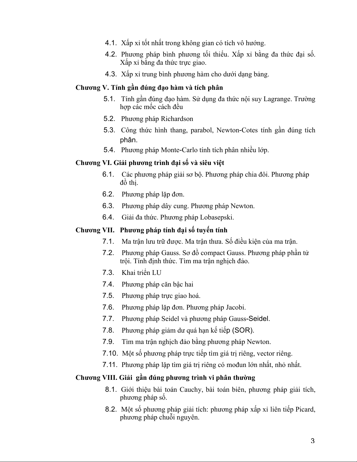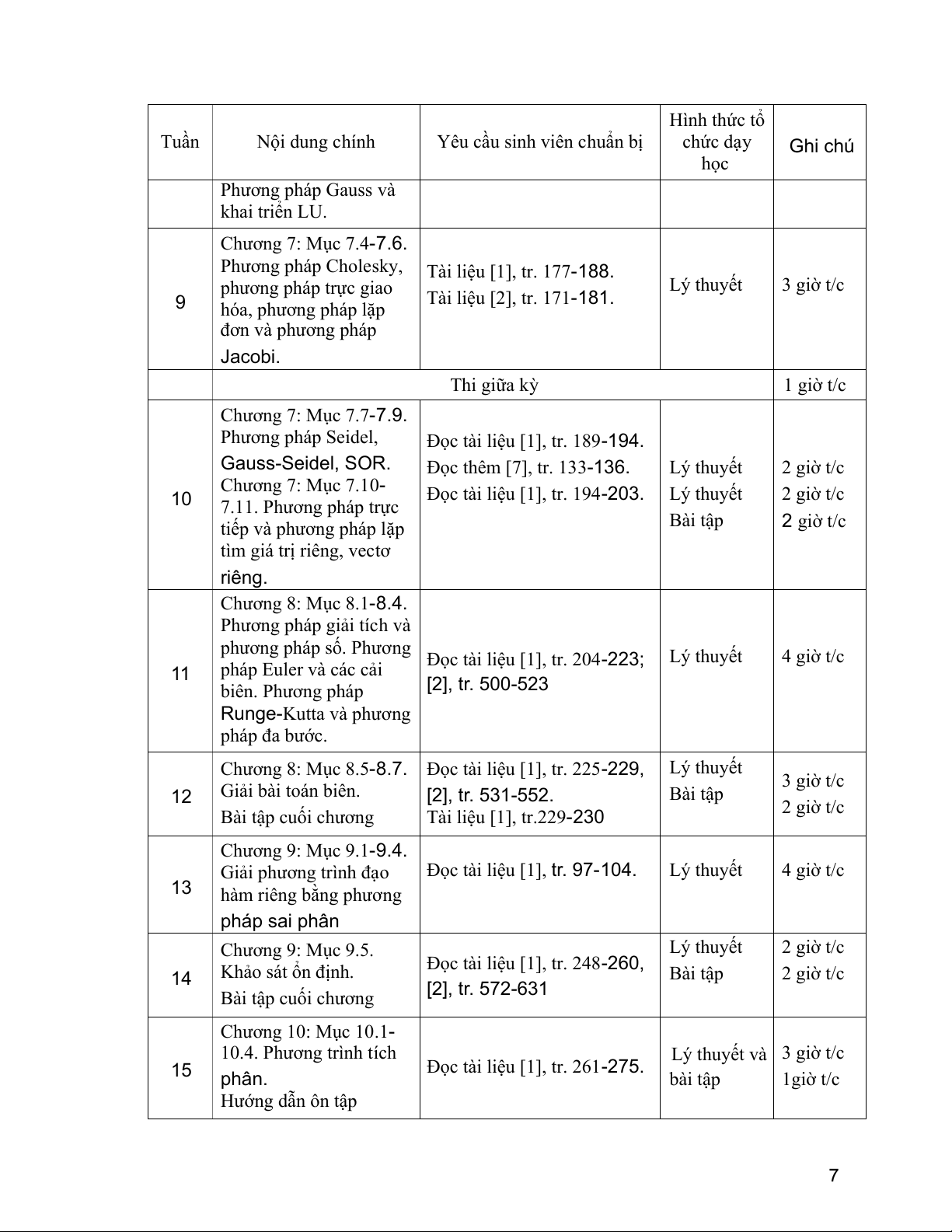 Phương pháp Cholesky, Tài liệu [1], tr. 177-188. phương pháp trực giao Lý thuyết 3 giờ t/c 9 Tài liệu [2], tr. 171-181. hóa, phương pháp lặp đơn và phương pháp Jacobi. Thi giữa kỳ 1 giờ t/c Chương 7: Mục 7.7-7.9. Phương pháp Seidel,