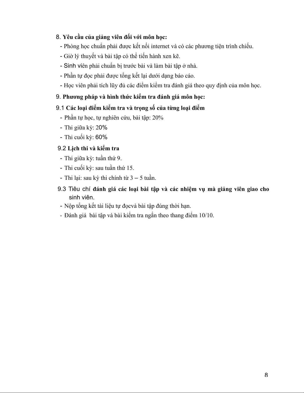 8. Yêu cầu của giảng viên đối với môn học:
