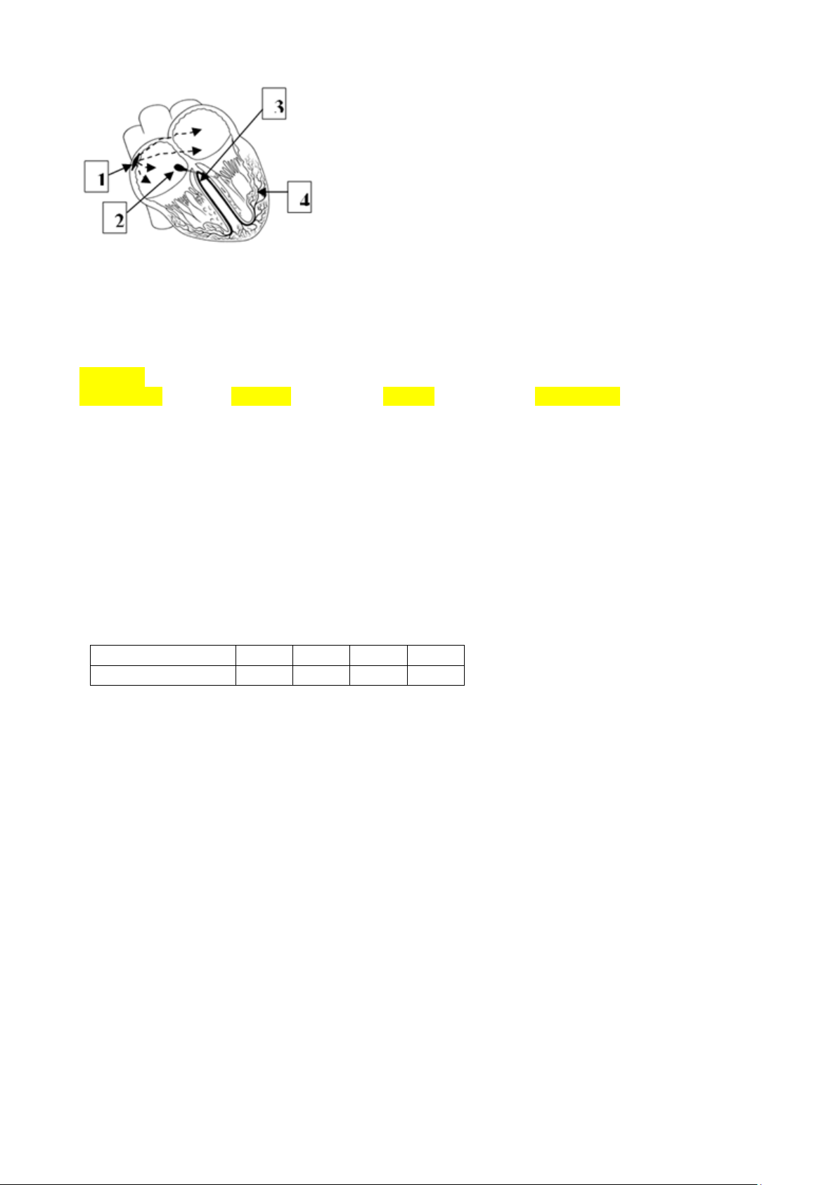 Câu 3: Quan sát hình sau cho biết, nút xoang nhĩ được chú thích số mấy? 👉 Đáp án: 1 2. nút nhĩ thất 3. bó His 4. mạng Purkinje