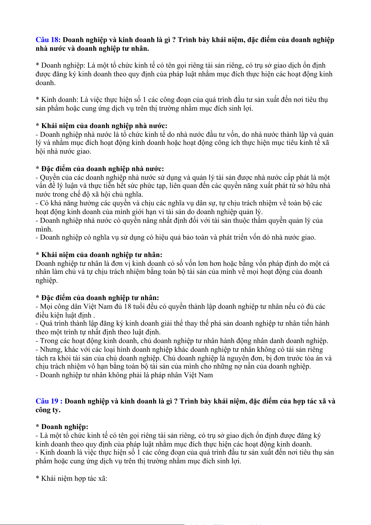 Câu 19 : Doanh nghiệp và kinh doanh là gì ? Trình bày khái niệm, đặc điểm của hợp tác xã và công ty. * Doanh nghiệp: