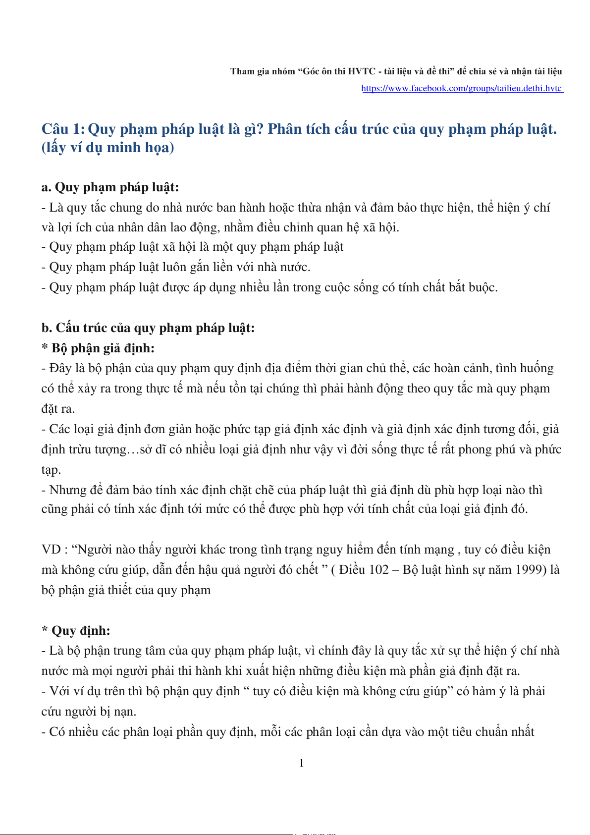 Câu 1: Quy phạm pháp luật là gì? Phân tích cấu trúc của quy phạm pháp luật. (lấy ví dụ minh
