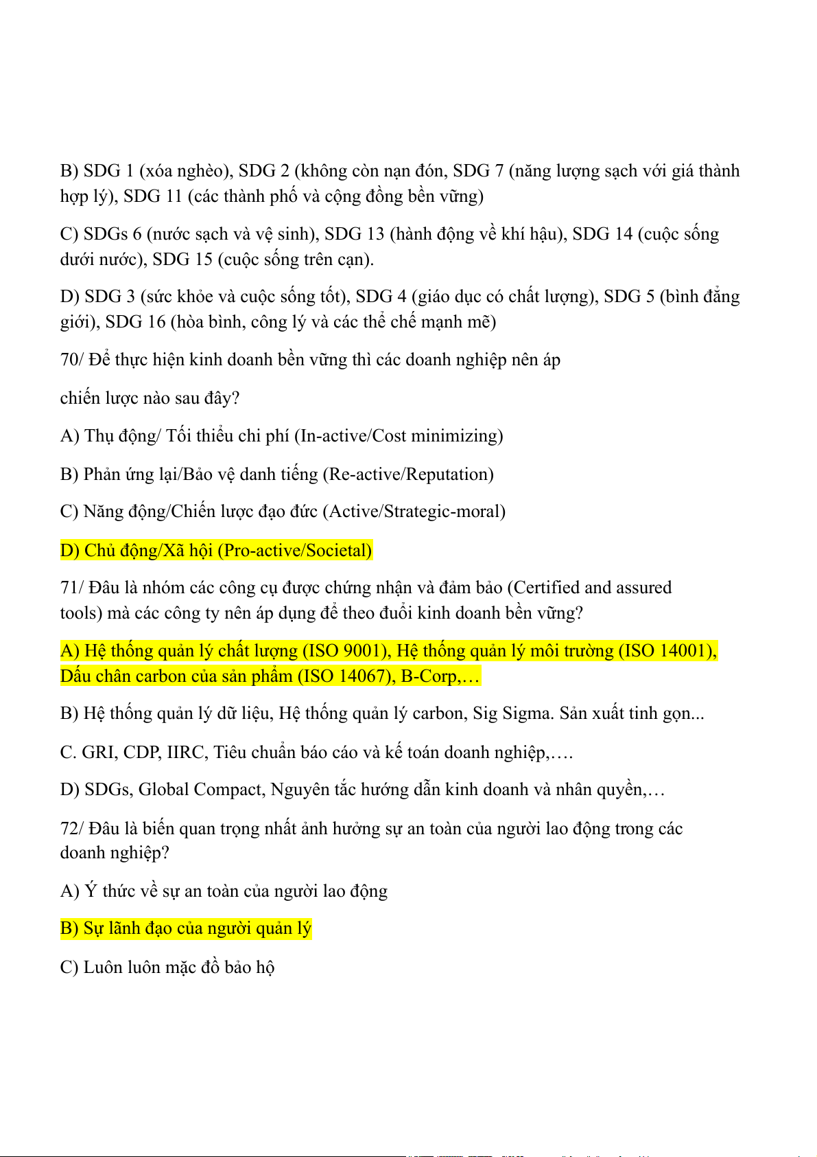 70/ Để thực hiện kinh doanh bền vững thì các doanh nghiệp nên áp