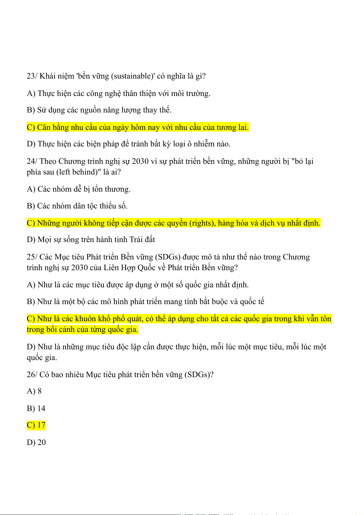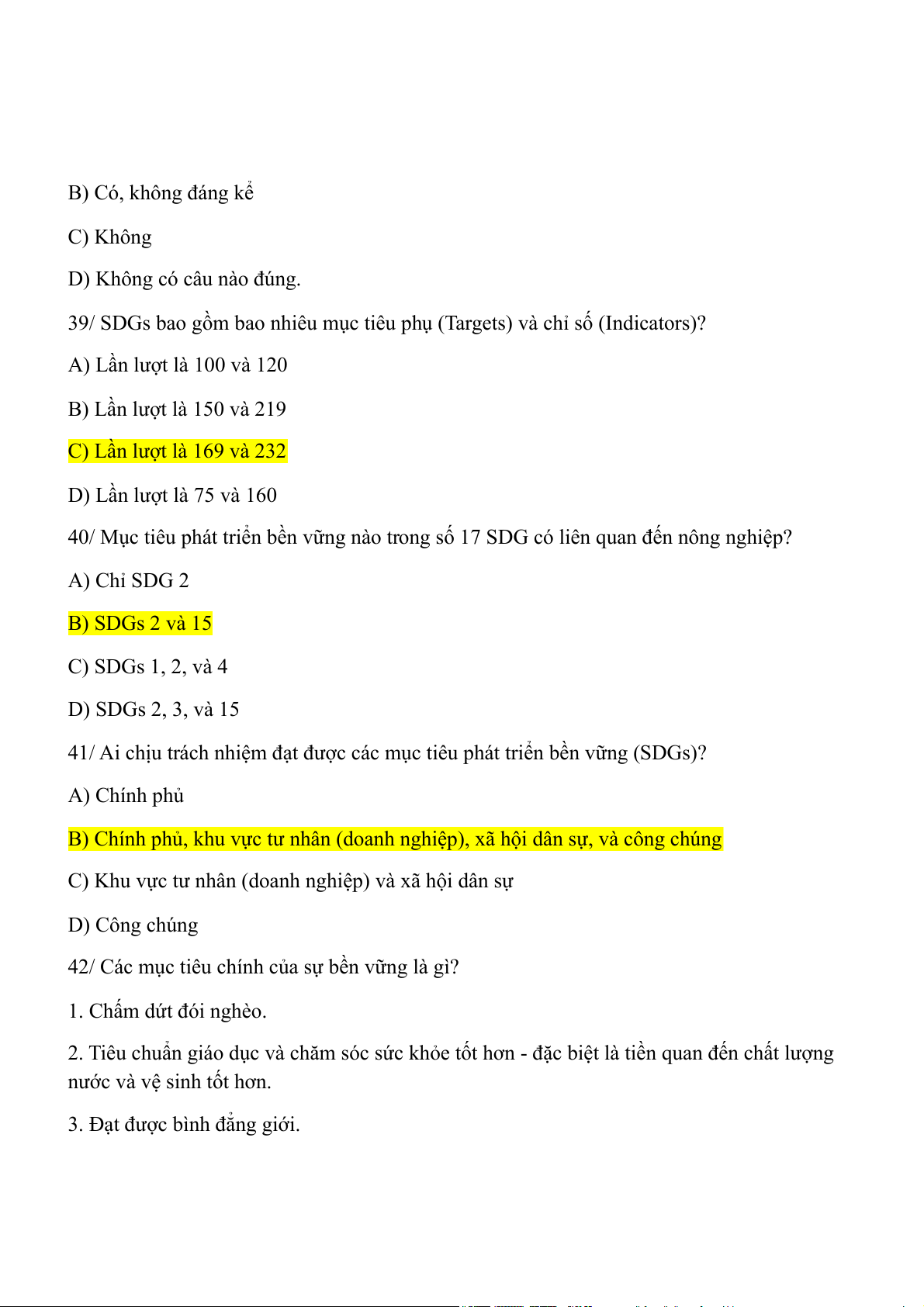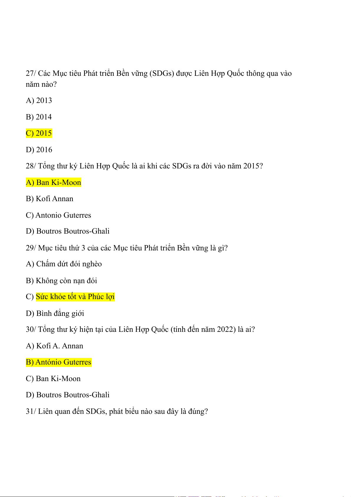 20/ Liên Hợp Quốc đặt mục tiêu đạt được SDGs vào năm nào? A) 2015 B) 2030 C) 2050 D) 2100
