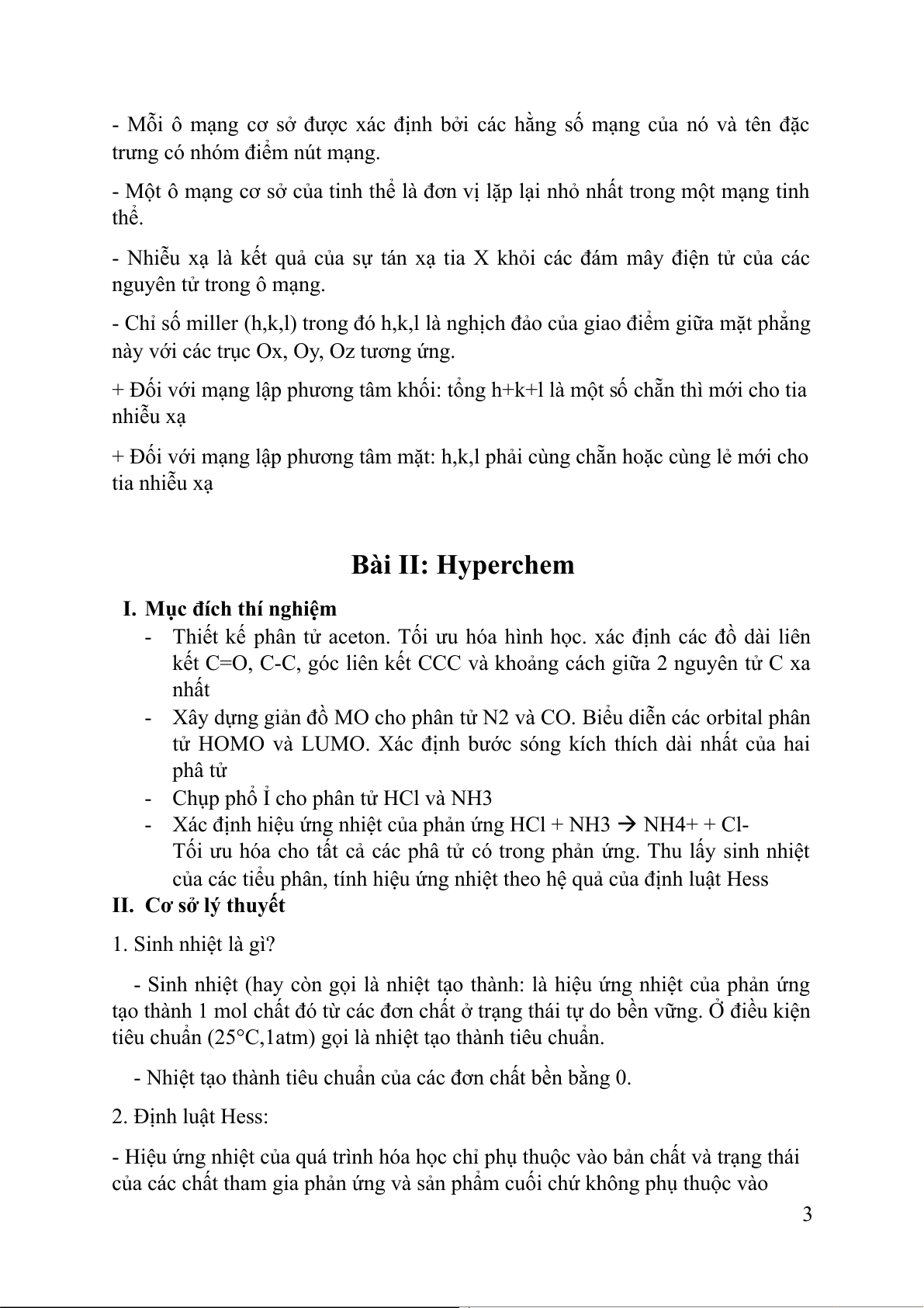 + Đối với mạng lập phương tâm mặt: h,k,l phải cùng chẵn hoặc cùng lẻ mới cho tia nhiễu xạ Bài II: Hyperchem