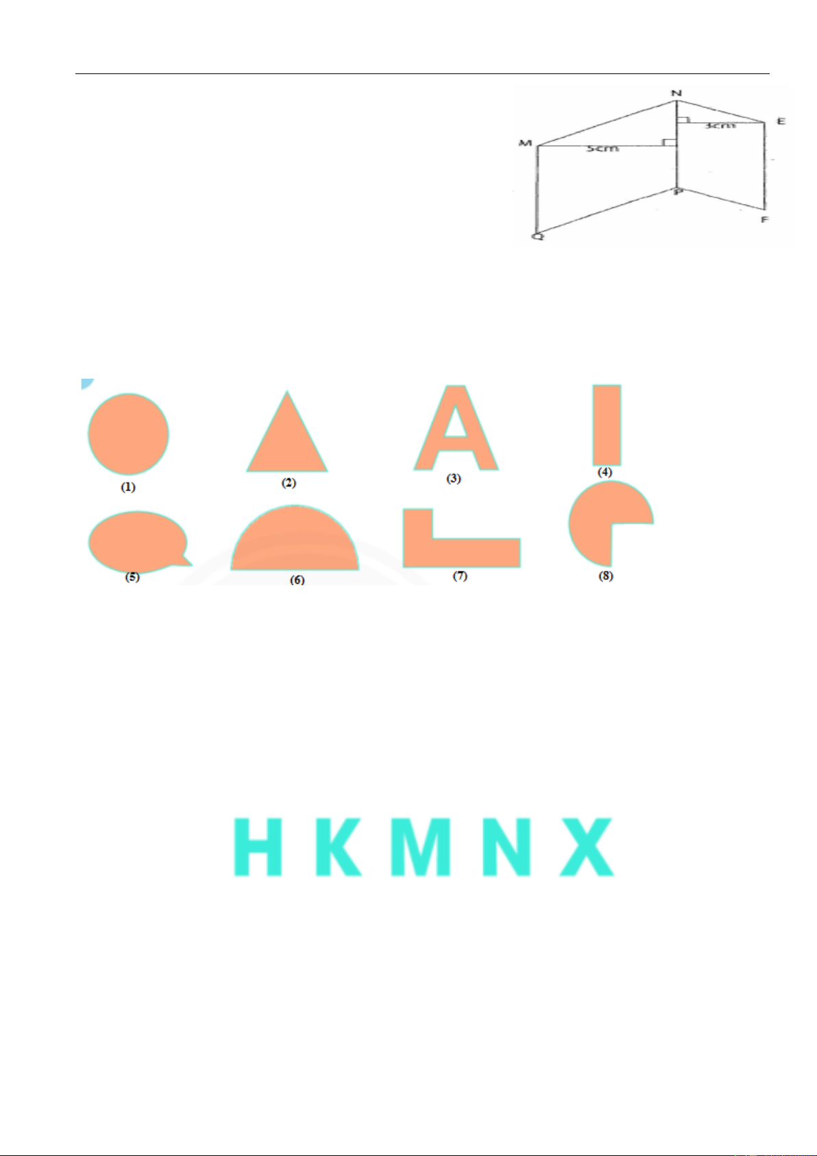 Câu 69. Trong những hình dưới đây, những hình có trục đối xứng là: A. 1,2,4 B. 1,2,4,6 C. 1,2,3,4,6,8 D. 1,2,4,5