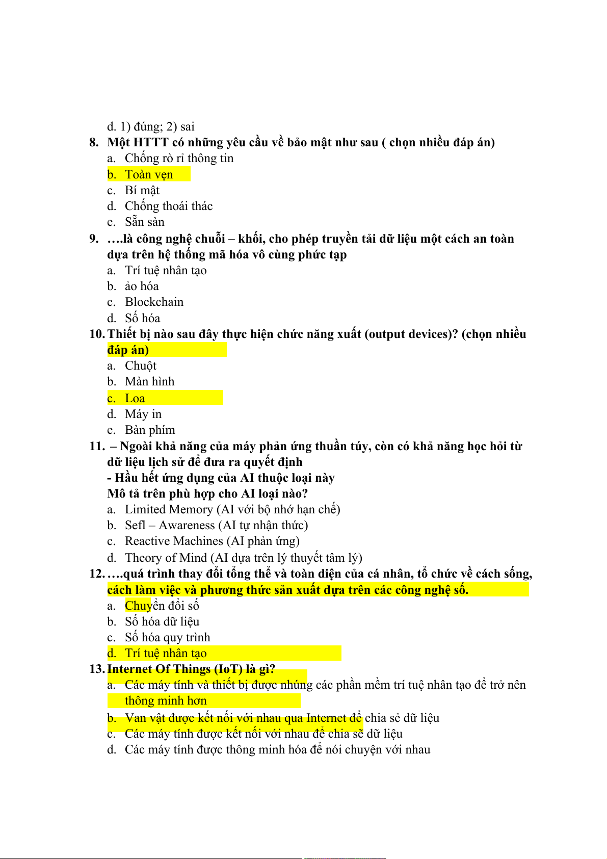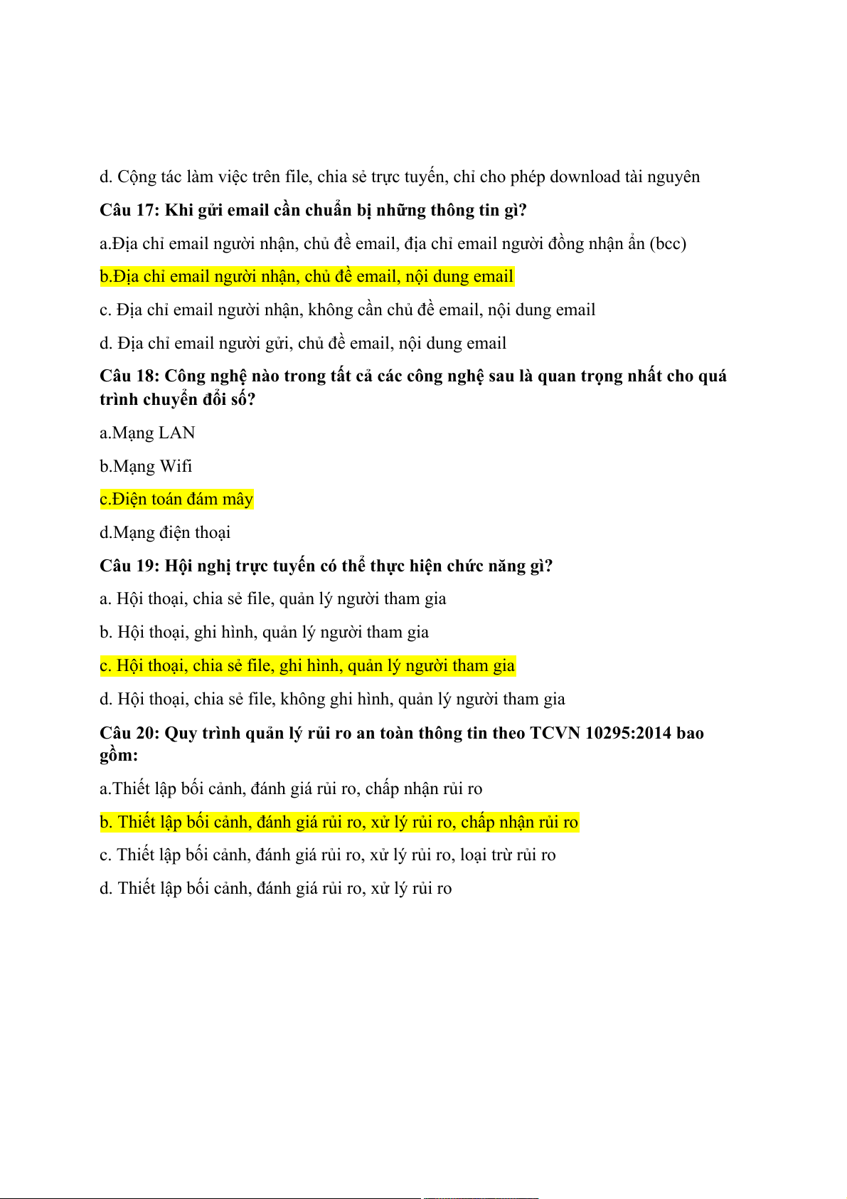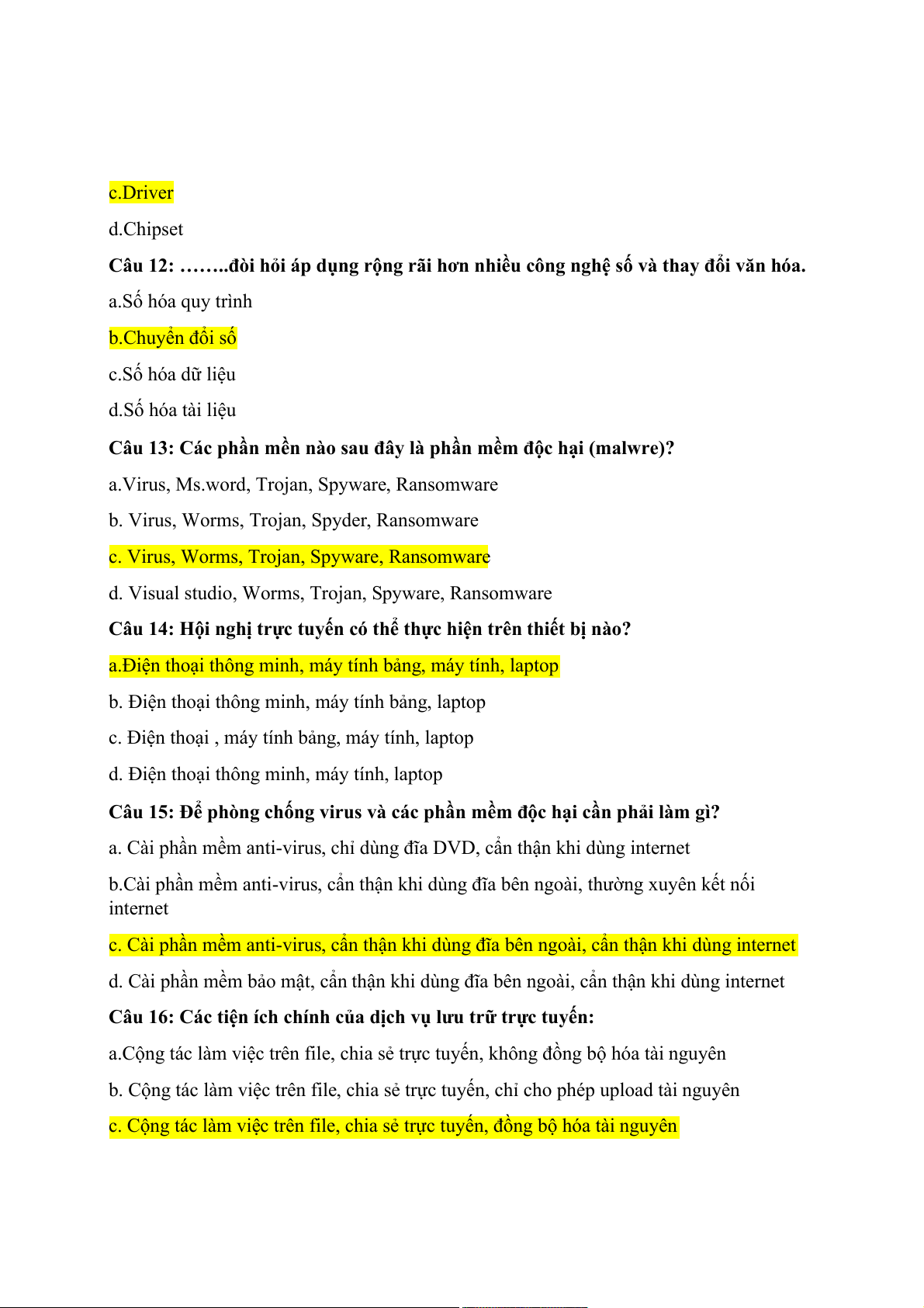 Câu 12: ……..đòi hỏi áp dụng rộng rãi hơn nhiều công nghệ số và thay đổi văn hóa. a.Số hóa quy trình b.Chuyển đổi số c.Số hóa dữ liệu d.Số hóa tài liệu