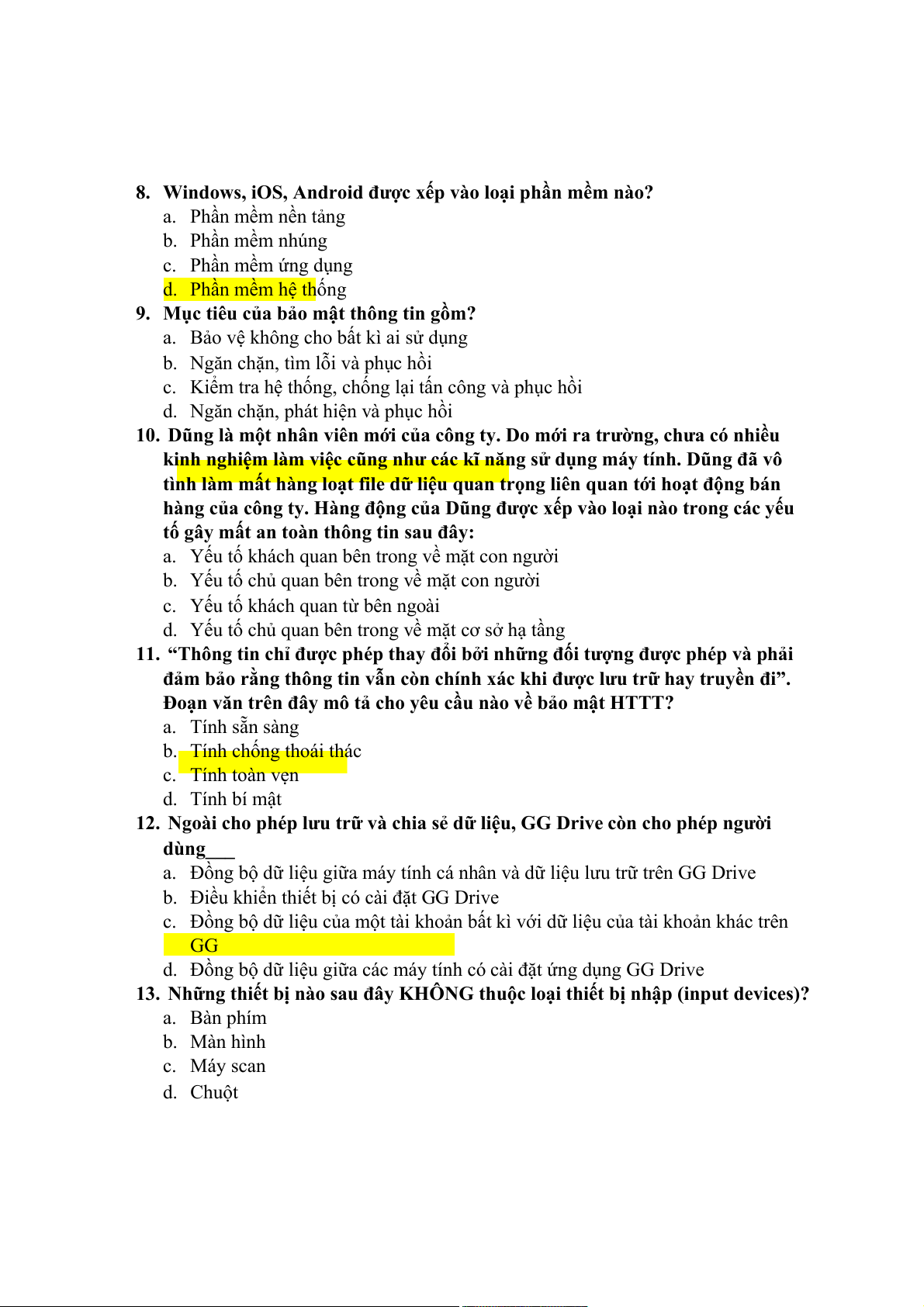 8. Một HTTT có những yêu cầu về bảo mật như sau ( chọn nhiều đáp án) a. Chống rò rỉ thông tin b. Toàn vẹn c. Bí mật d. Chống thoái thác e. Sẵn sàn