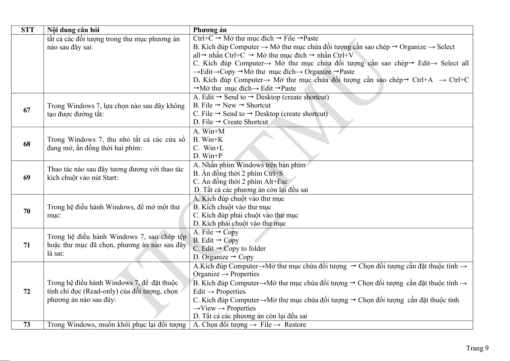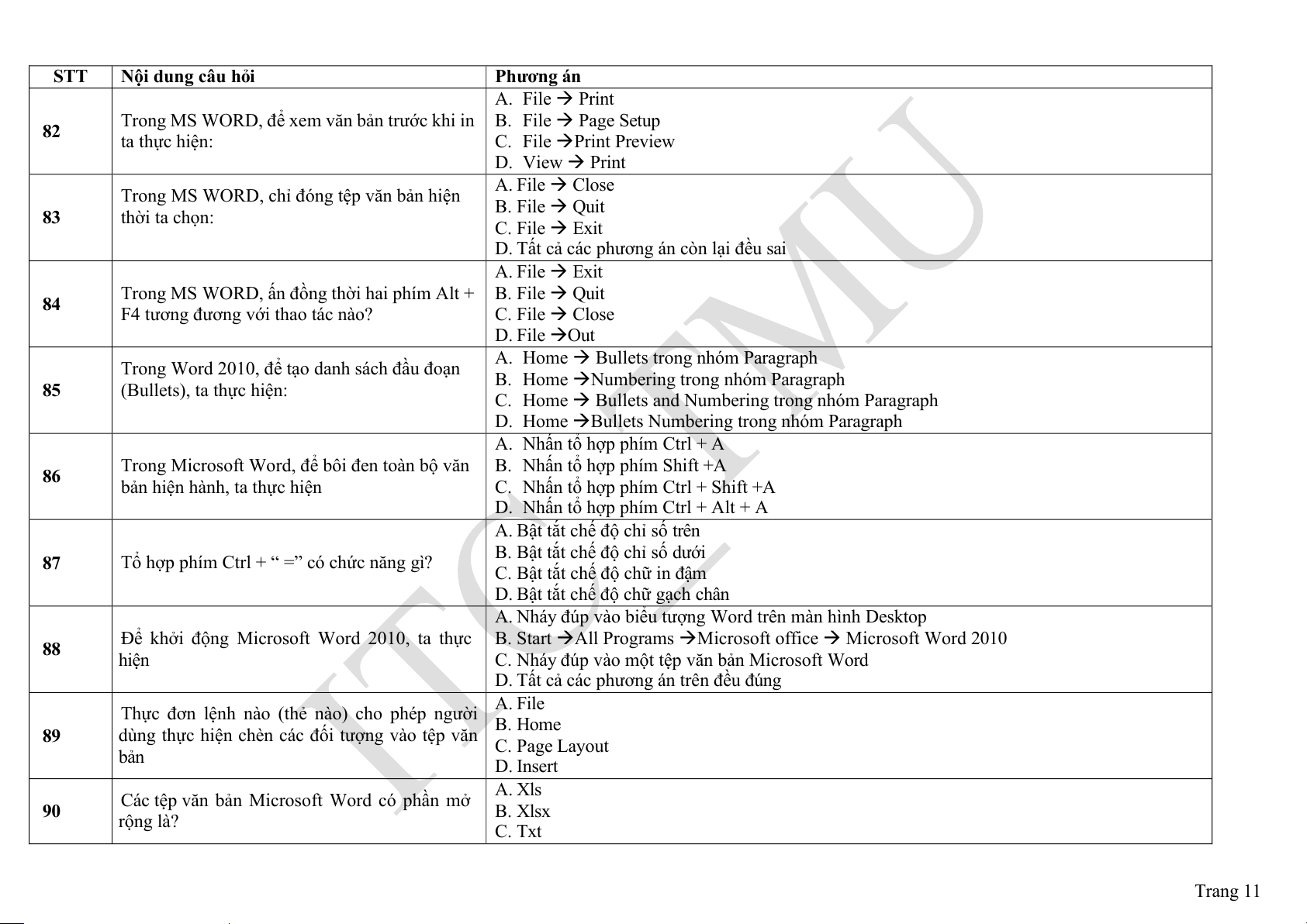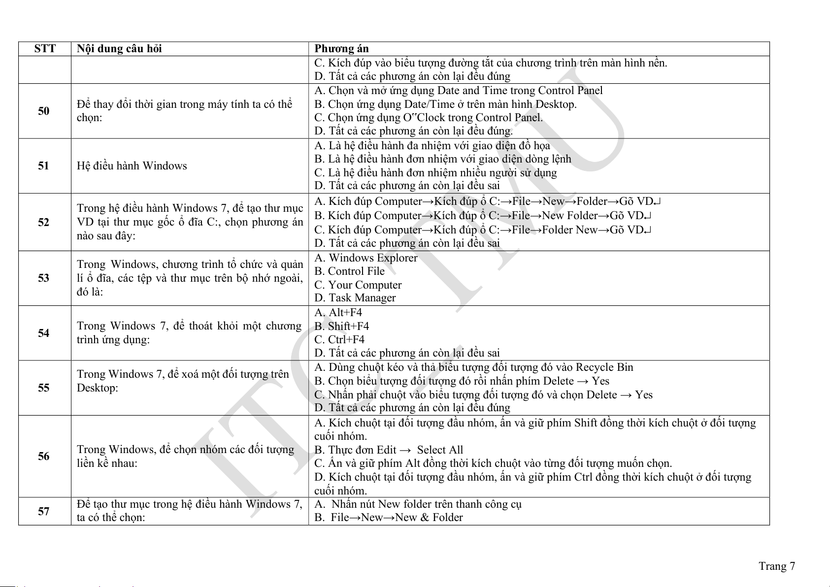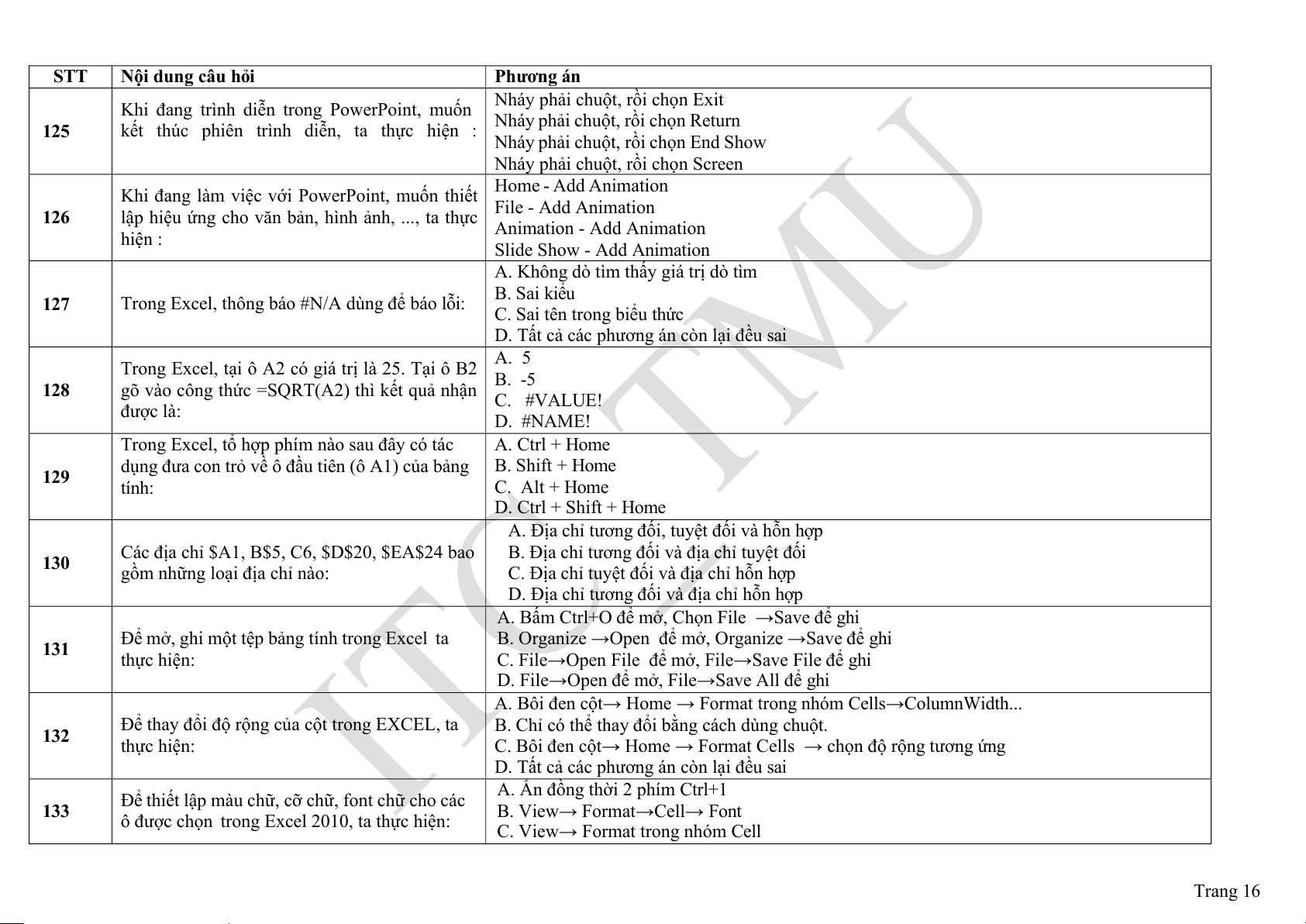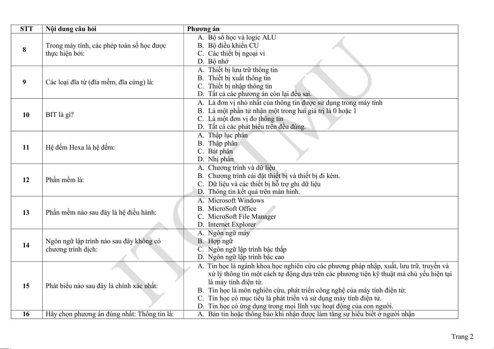 D. Tất cả các phương án còn lại đều đúng. Trang 1 STT Nội dung câu hỏi Phương án