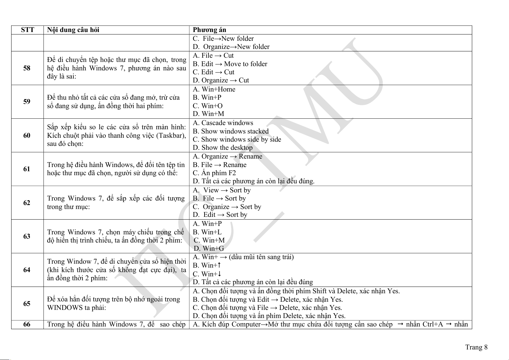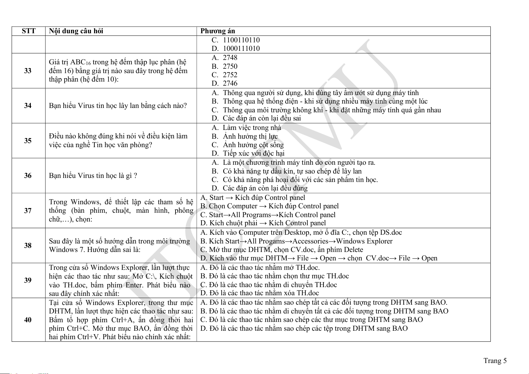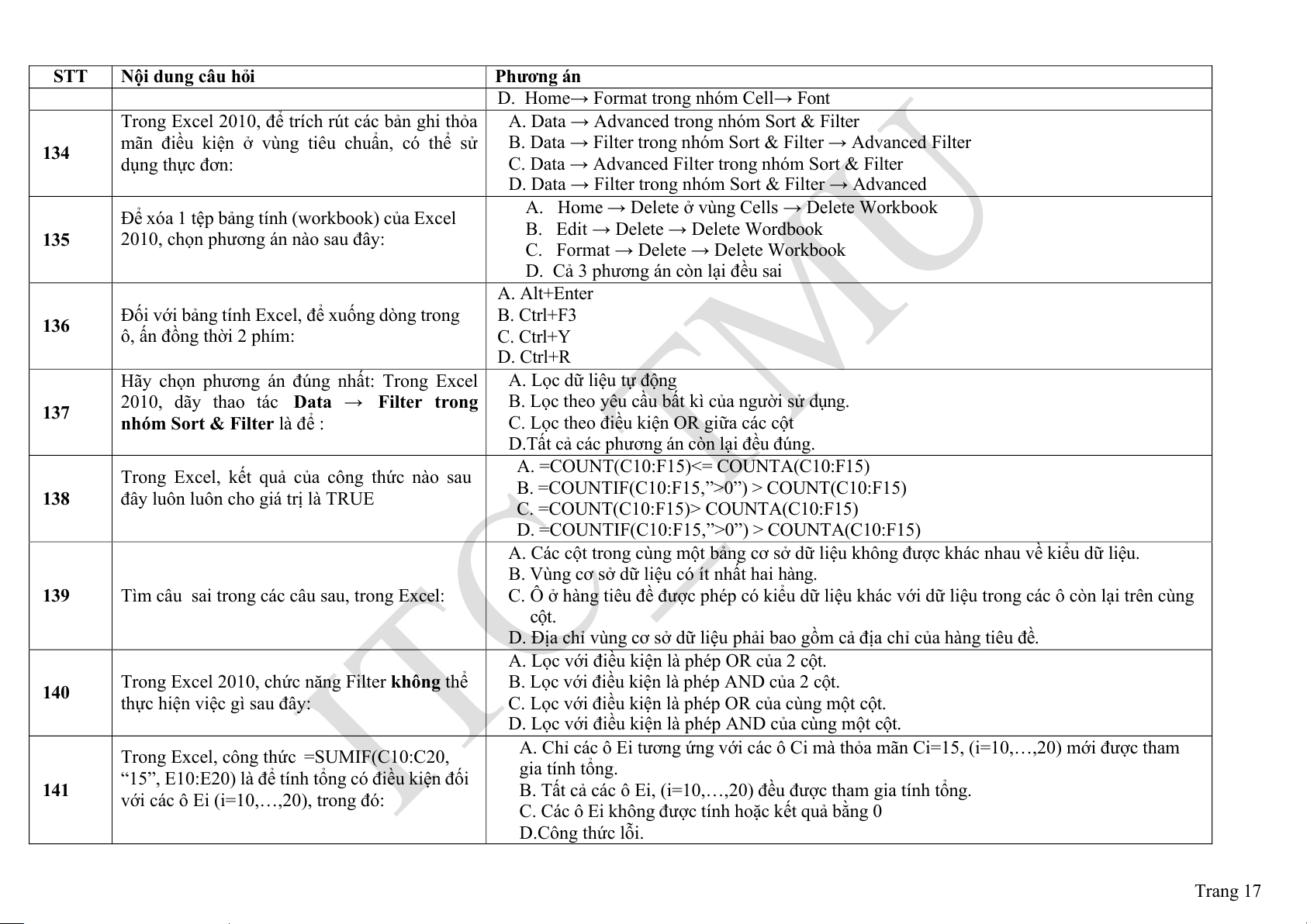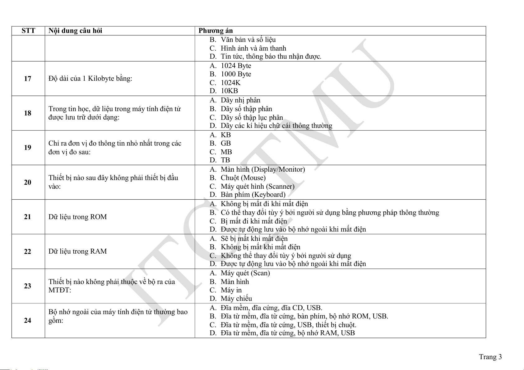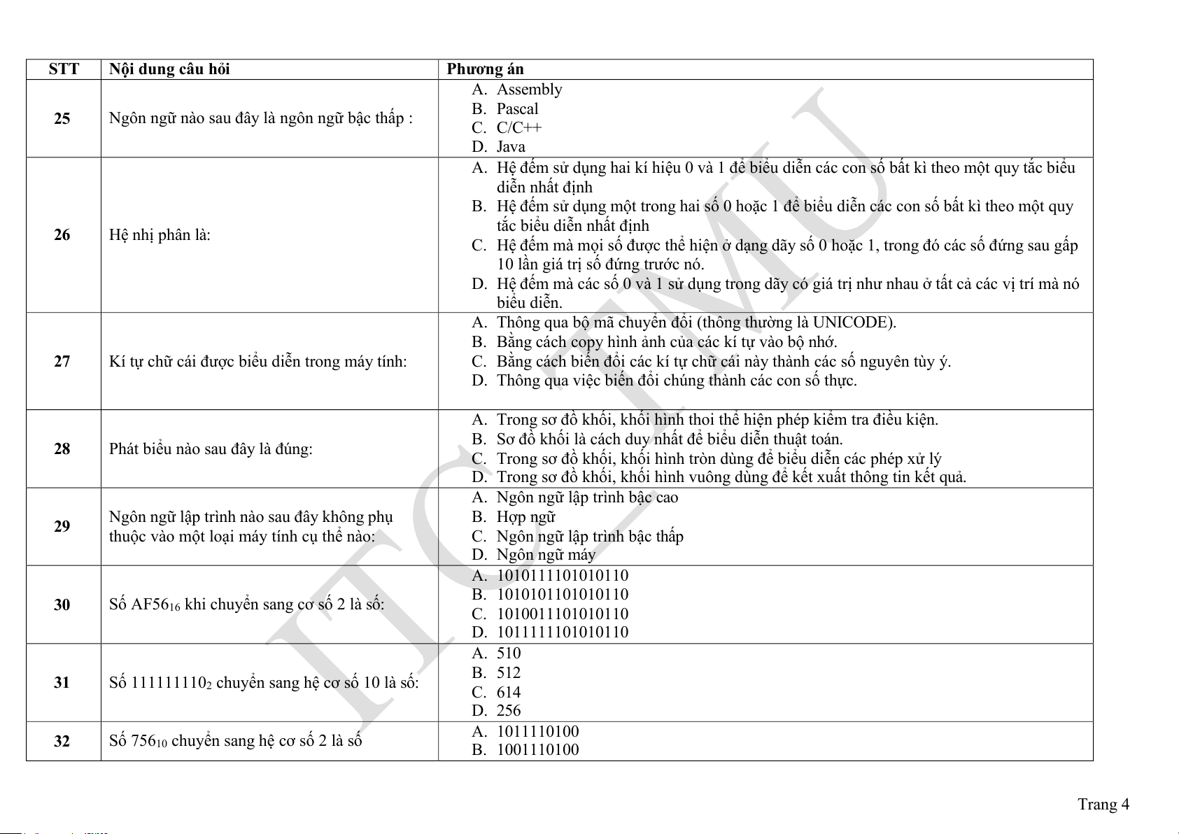 D. Đĩa từ mềm, đĩa từ cứng, bộ nhớ RAM, USB Trang 3 STT Nội dung câu hỏi Phương án A. Assembly B. Pascal 25