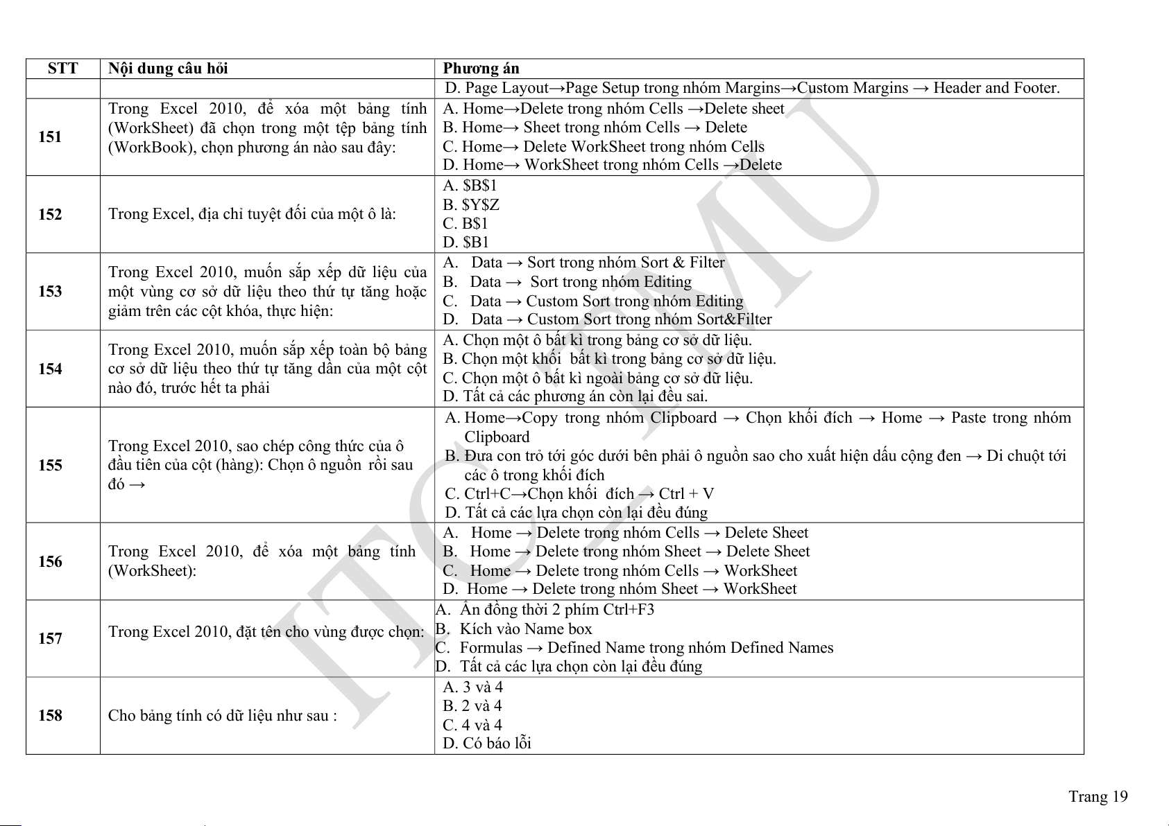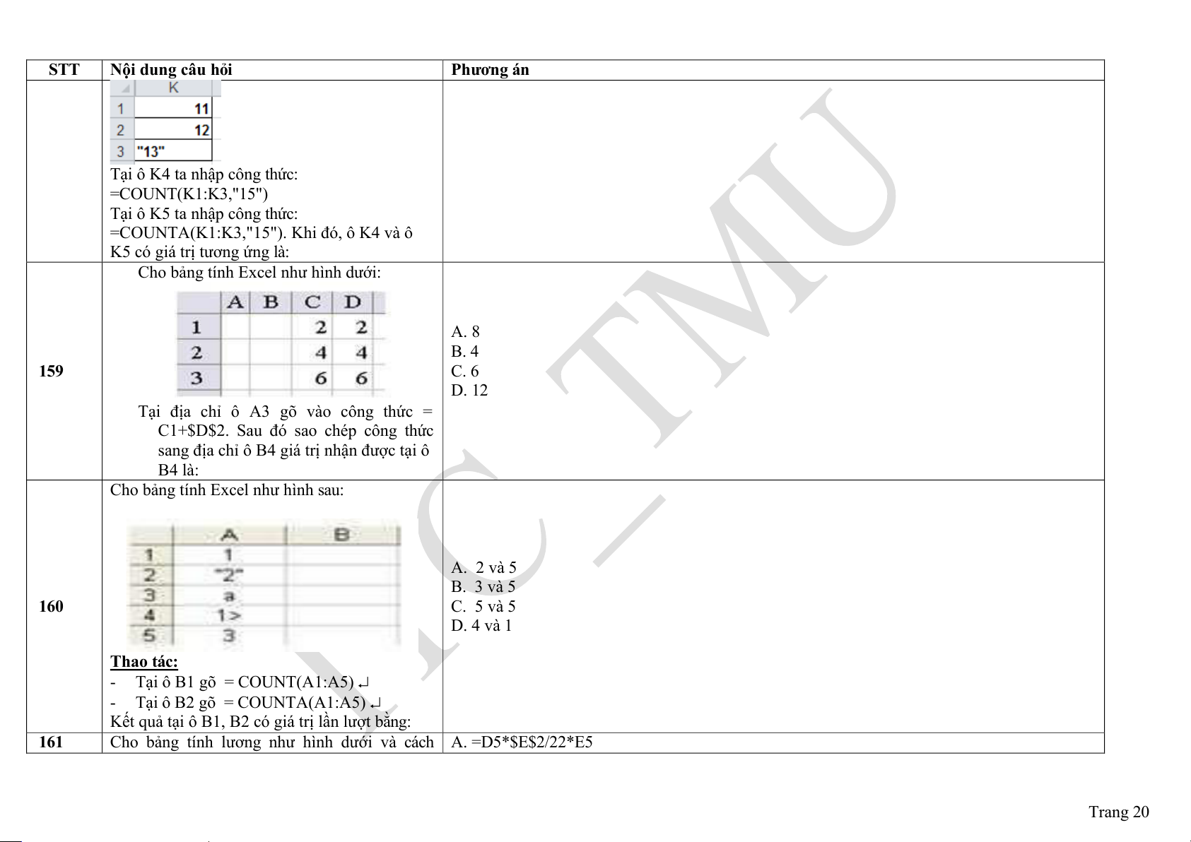 Cho bảng tính có dữ liệu như sau : C. 4 và 4 D. Có báo lỗi Trang 19 STT Nội dung câu hỏi Phương án