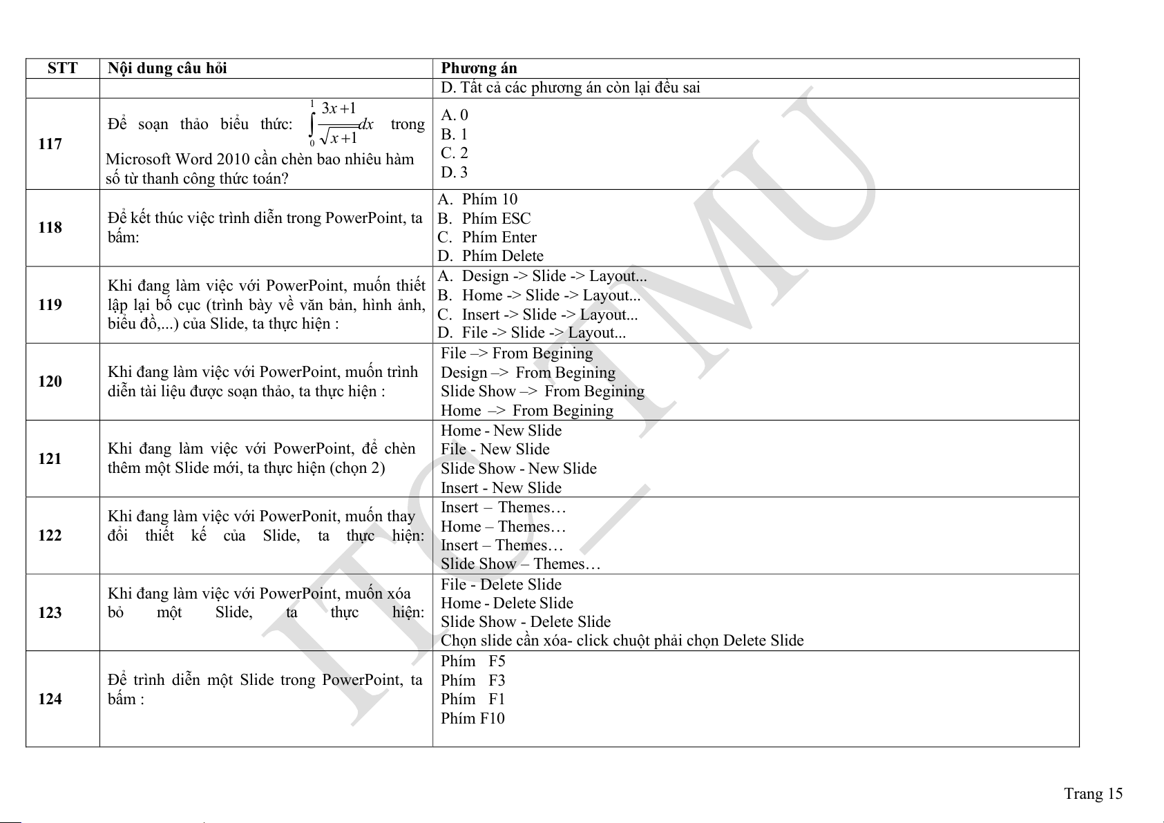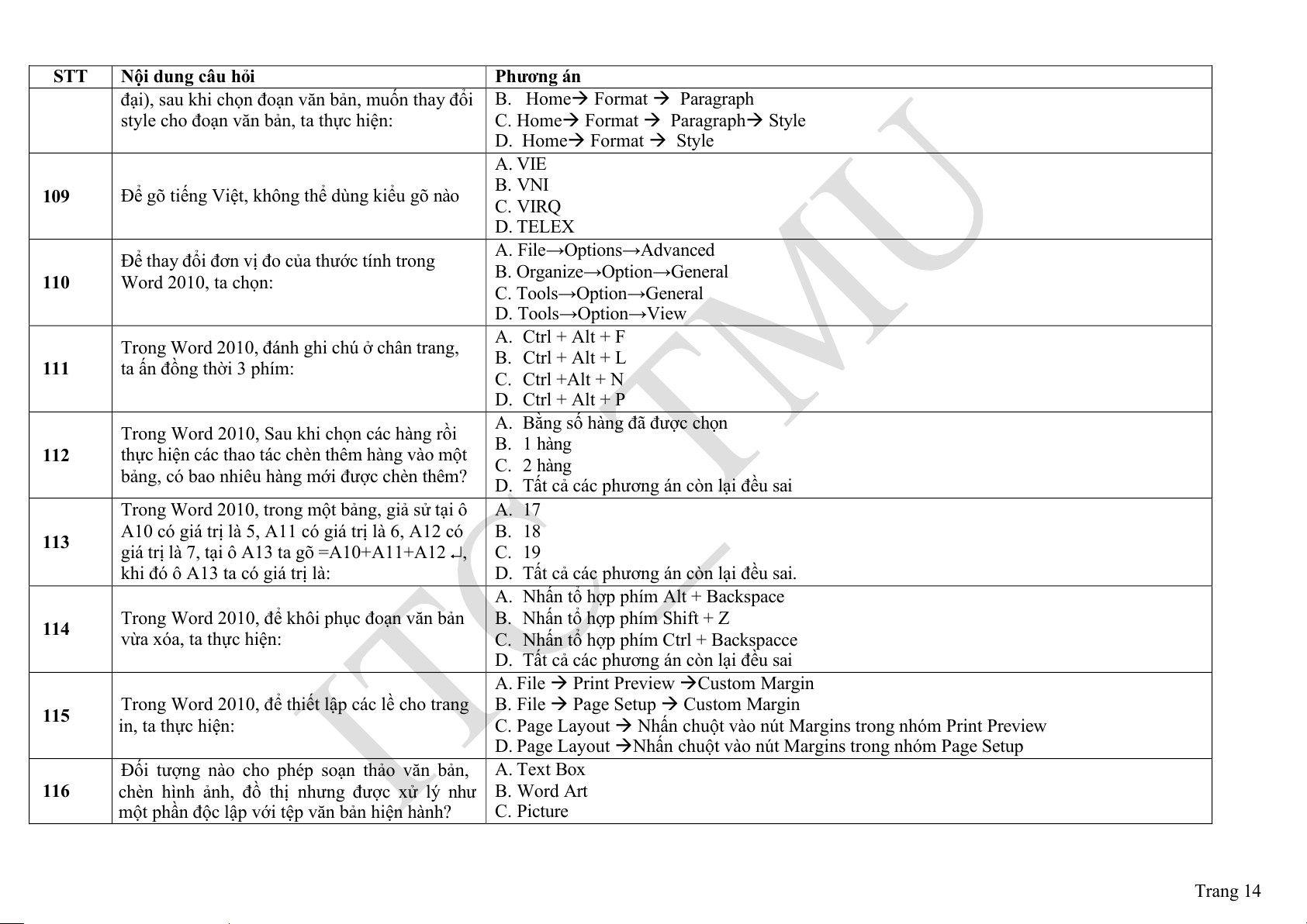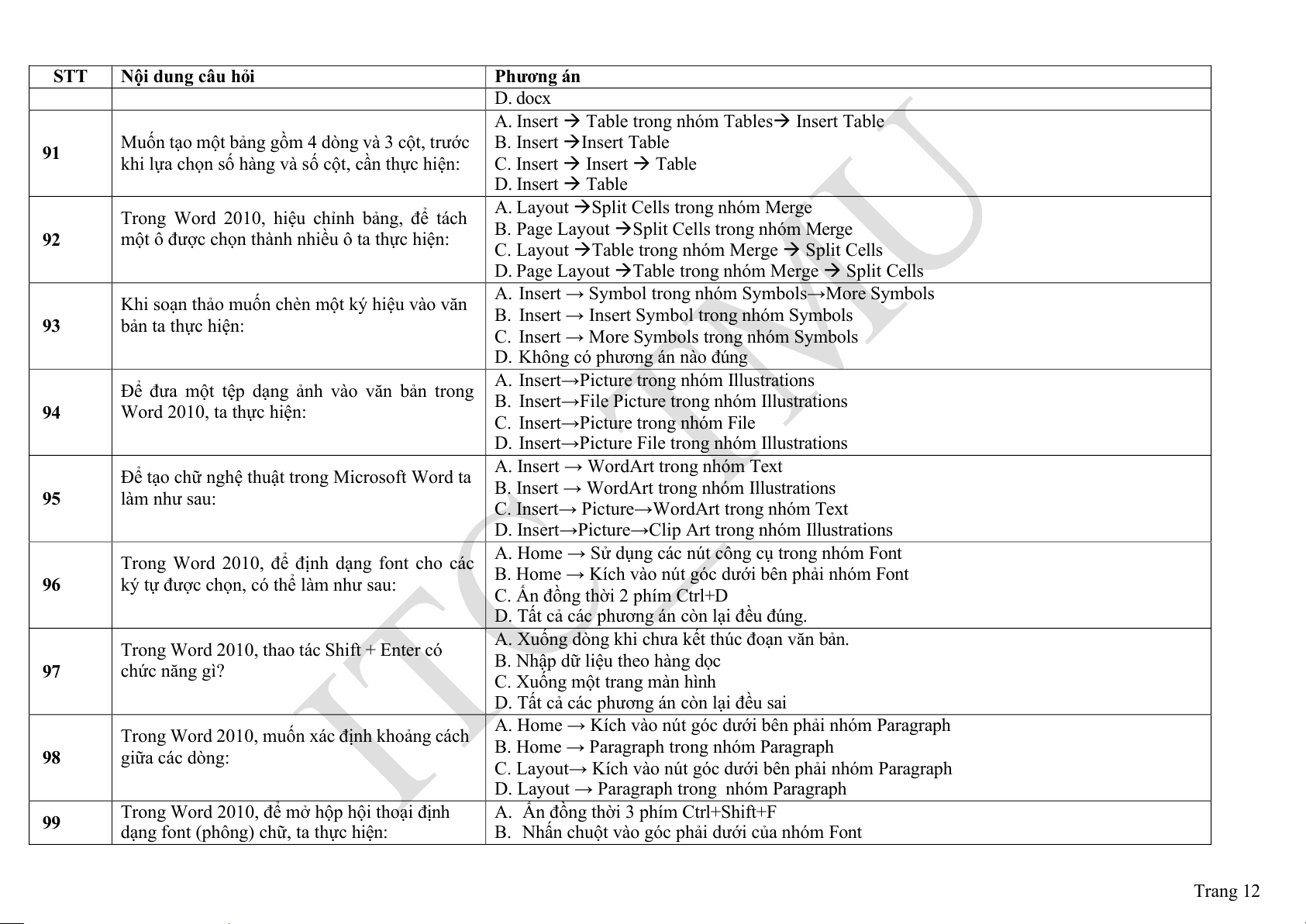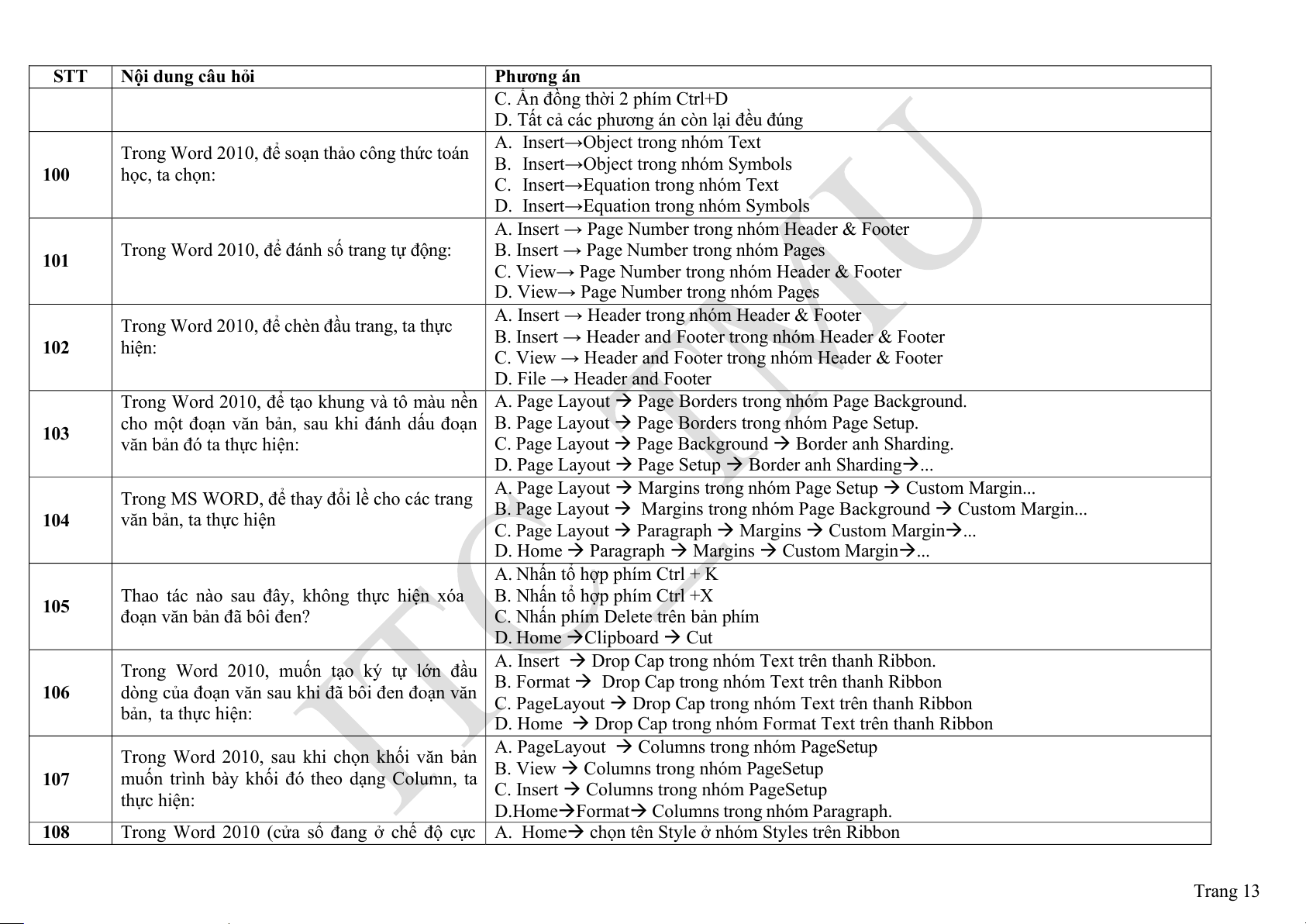 C. Insert → Header and Footer trong nhóm Page Setup . Trang 18 STT Nội dung câu hỏi Phương án