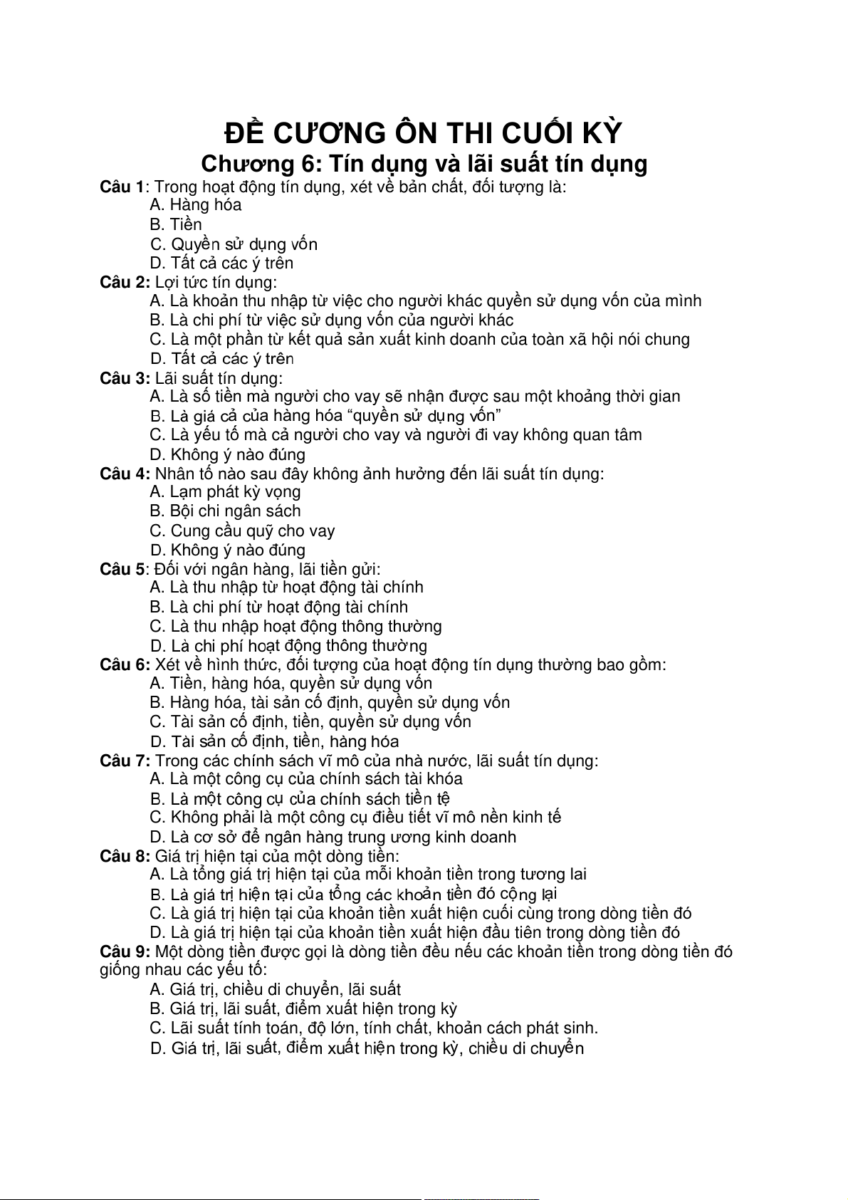 Câu 1: Trong hoạt động tín dụng, xét về bản ch n ất, đối tượ g là: A. Hàng hóa B. Tiền ề ử ụ ố D. Tất cả các ý trên