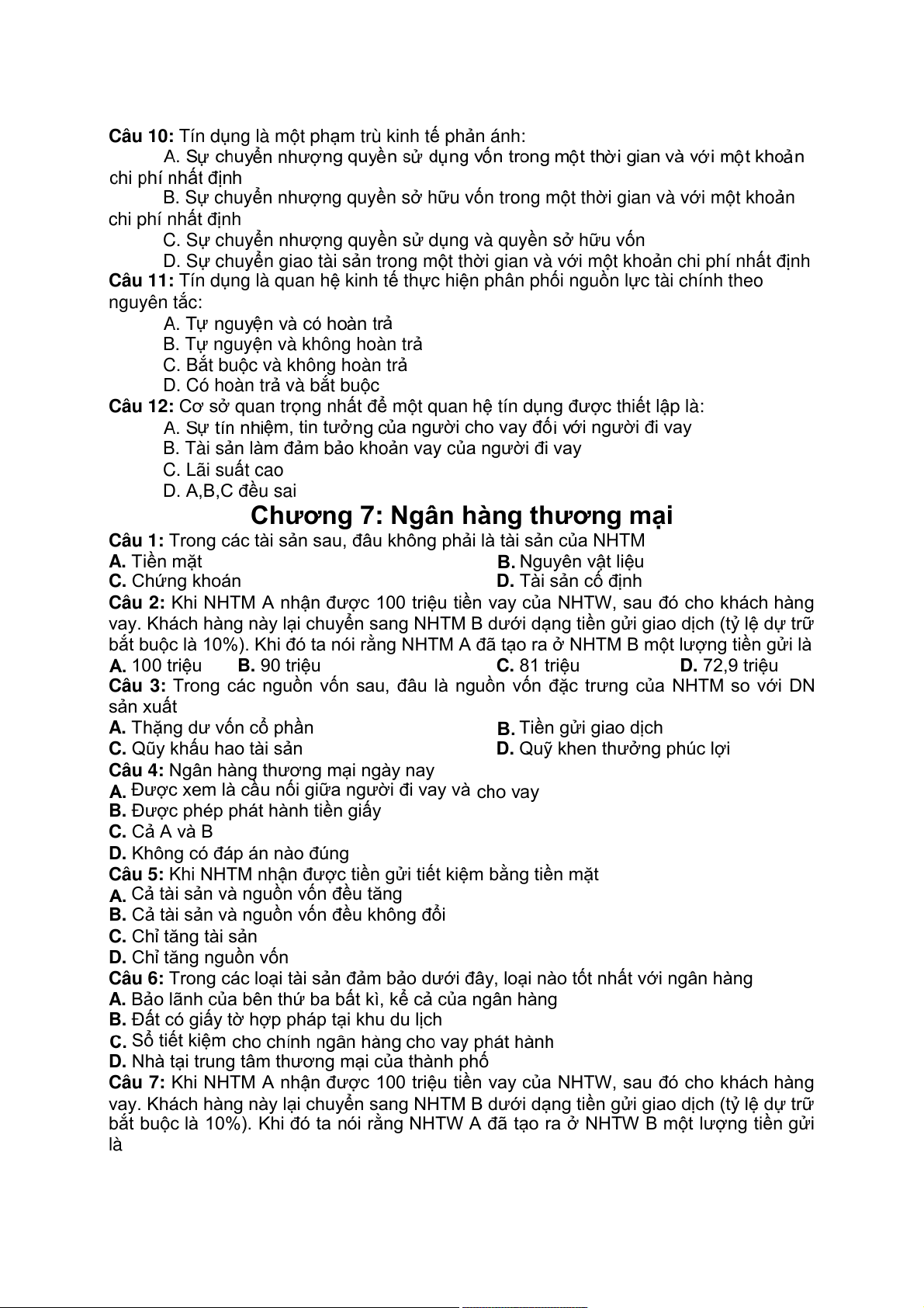 Câu 7: Khi NHTM A nhận được 100 triệu tiền vay của NHTW, sau đó cho khách hàng