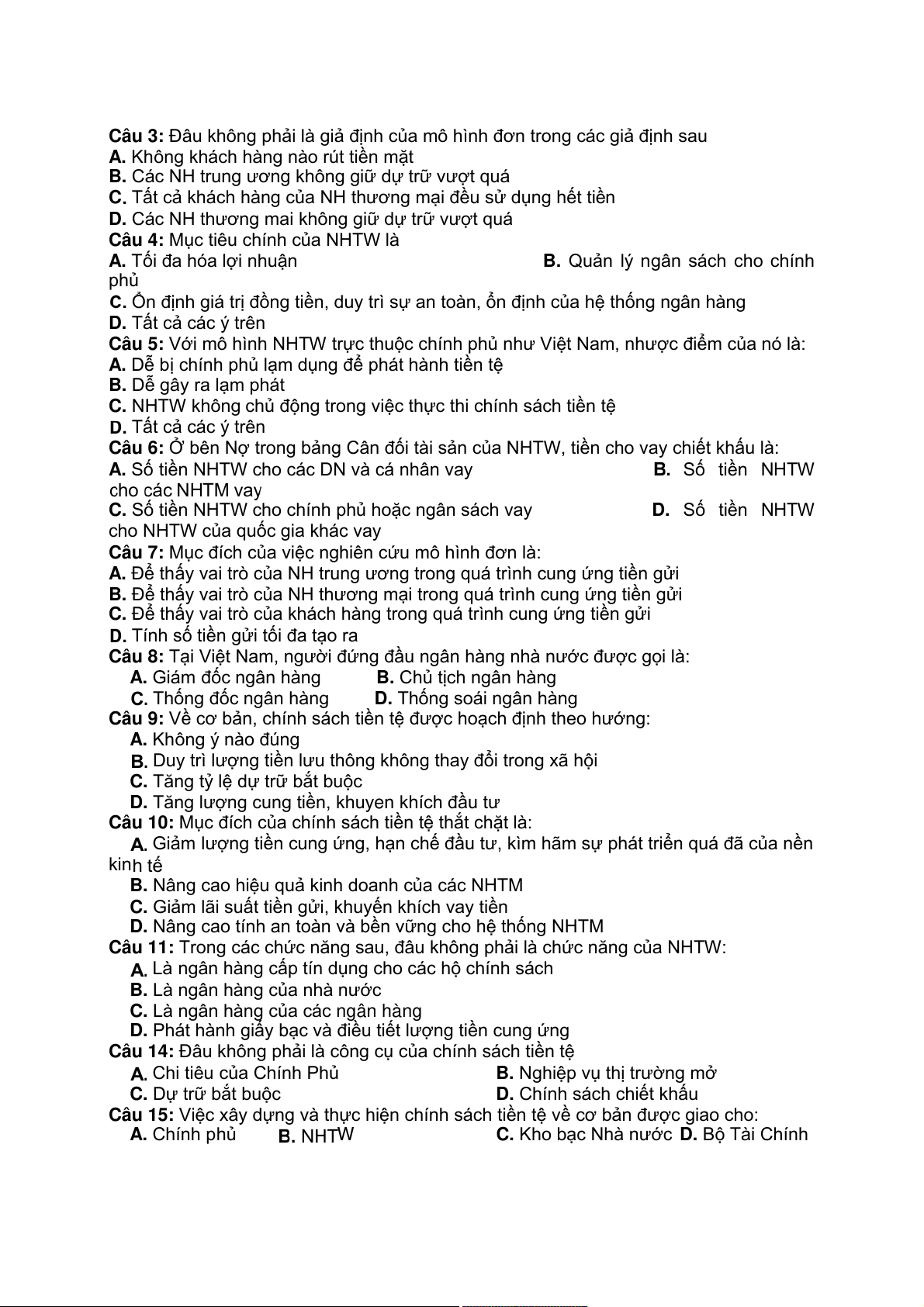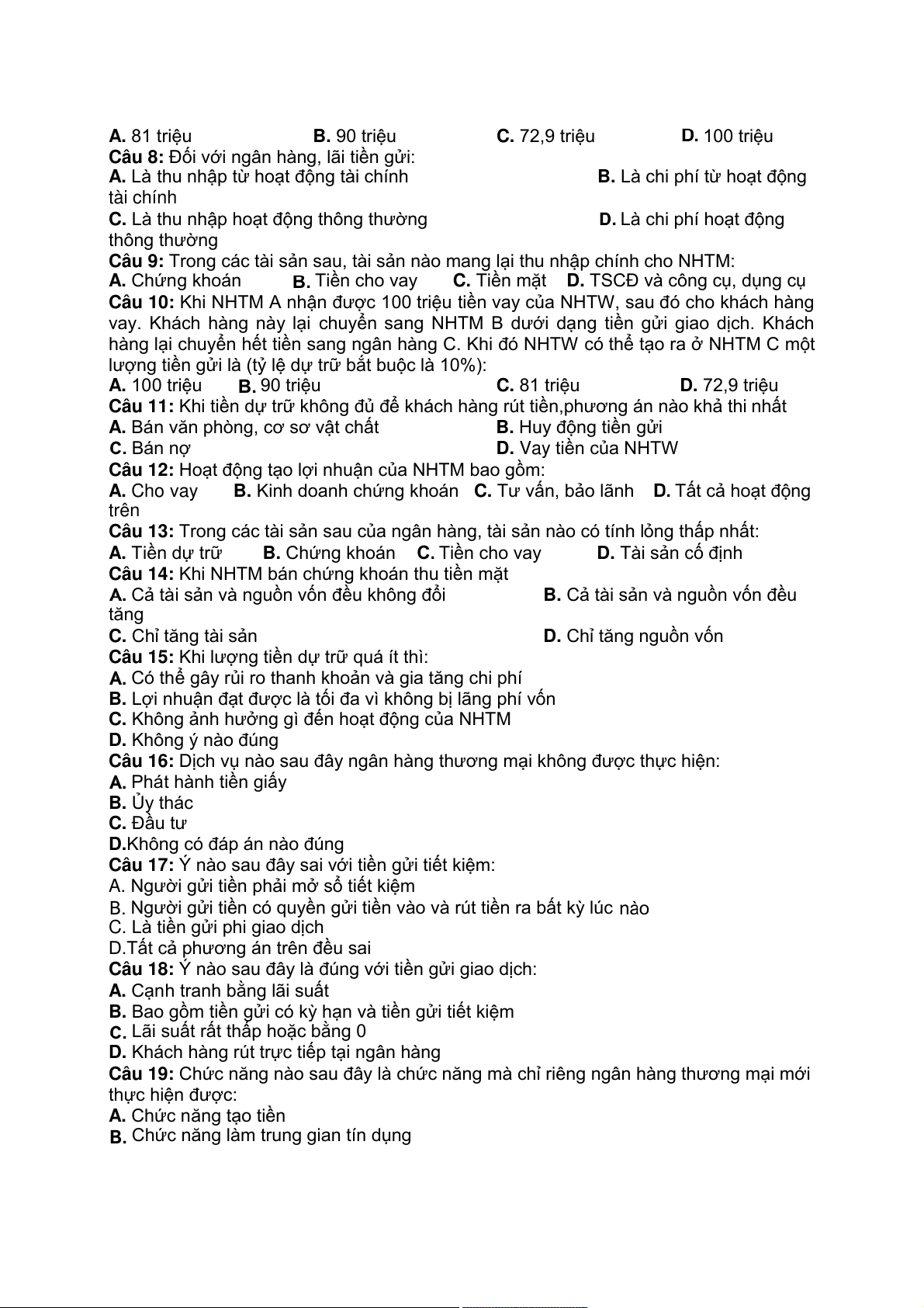 Câu 10: Khi NHTM A nhận được 100 triệu tiền vay của NHTW, sau đó cho khách hàng