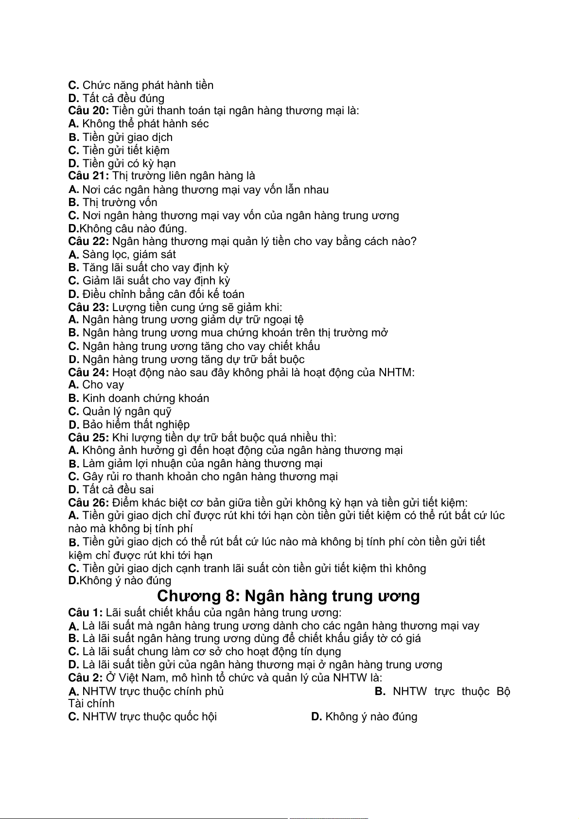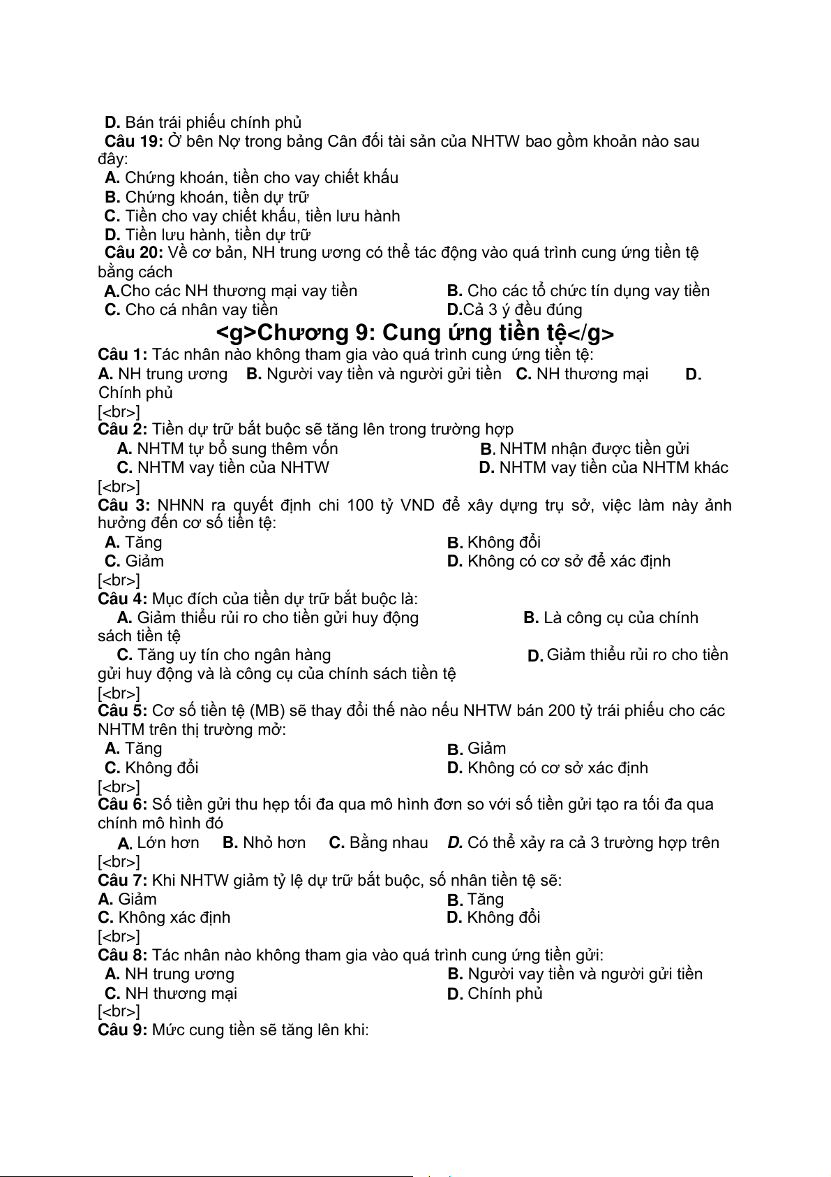 Câu 20: Về cơ bản, NH trung ương có thể tác động vào quá trình cung ứng tiền tệ bằng cách