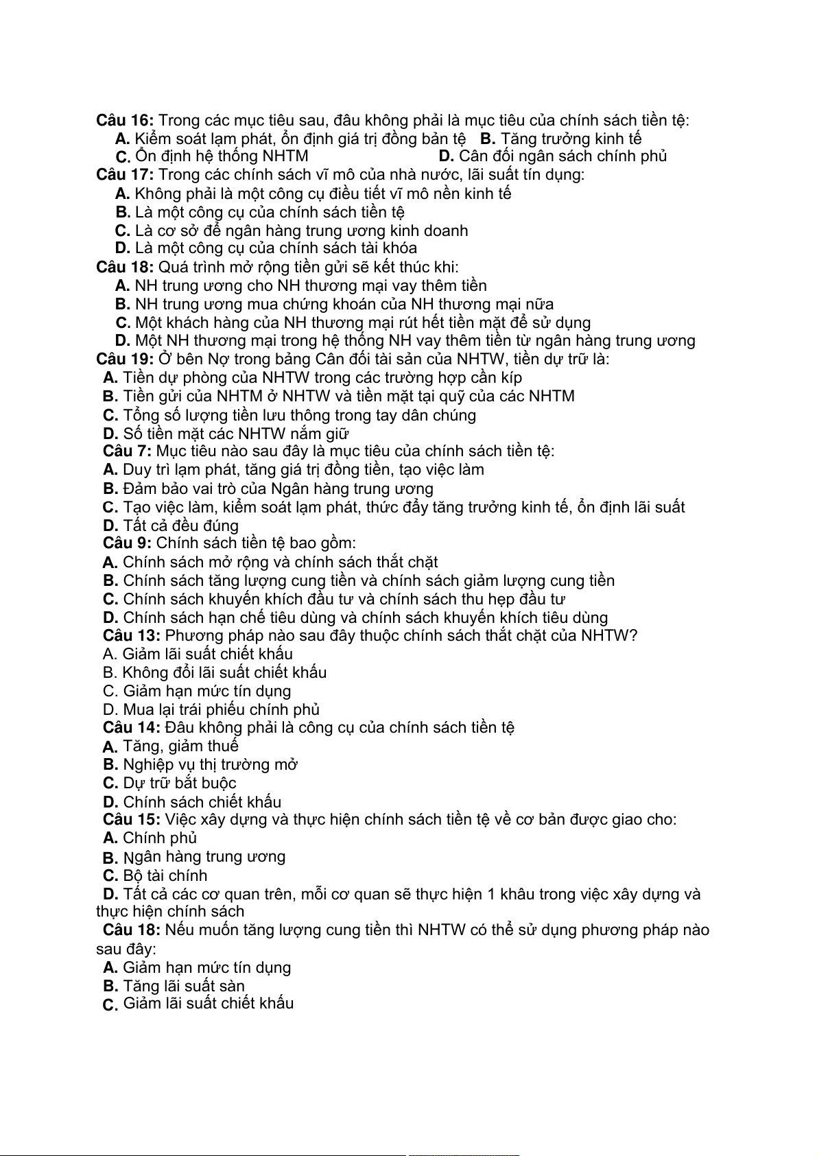 Câu 18: Nếu muốn tăng lượng cung tiền thì NHTW có thể sử dụng phương pháp nào sau đây: