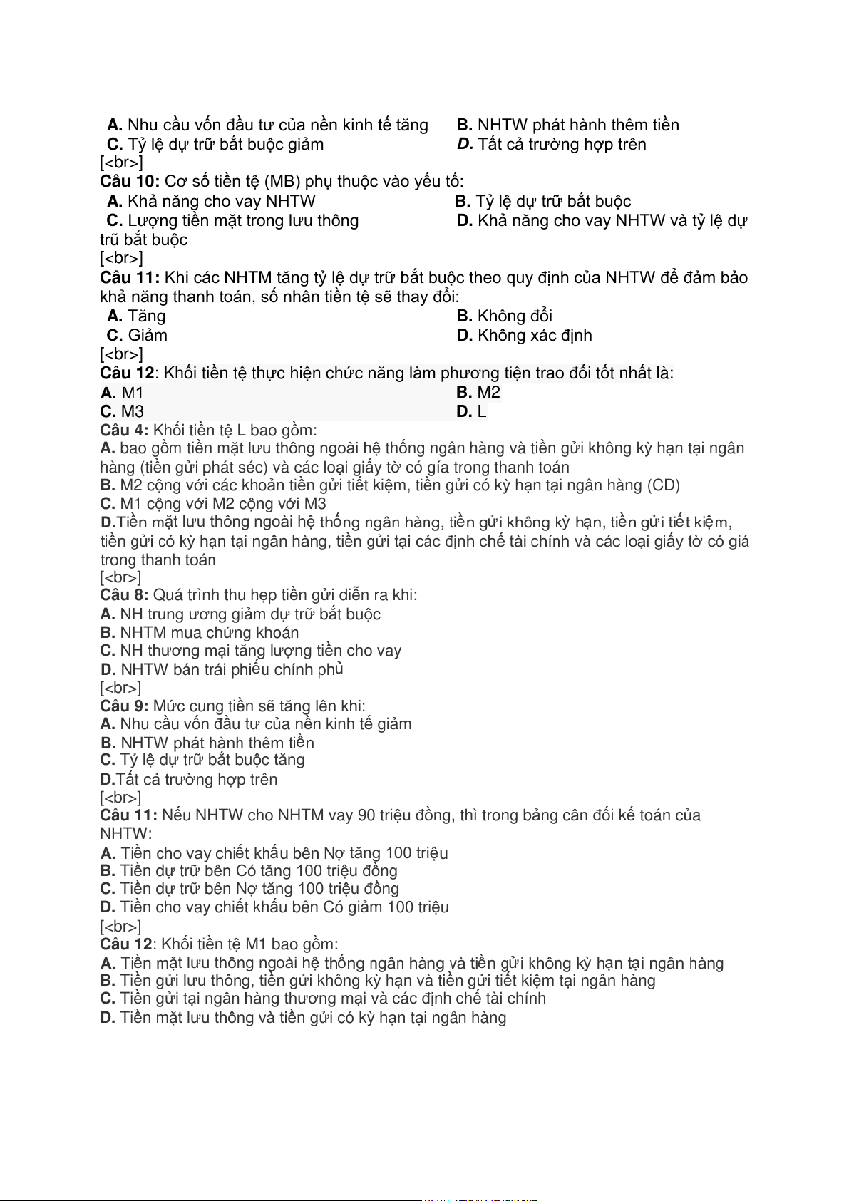 Câu 11: Khi các NHTM tăng tỷ lệ dự trữ bắt buộc theo quy định của NHTW để đảm bảo