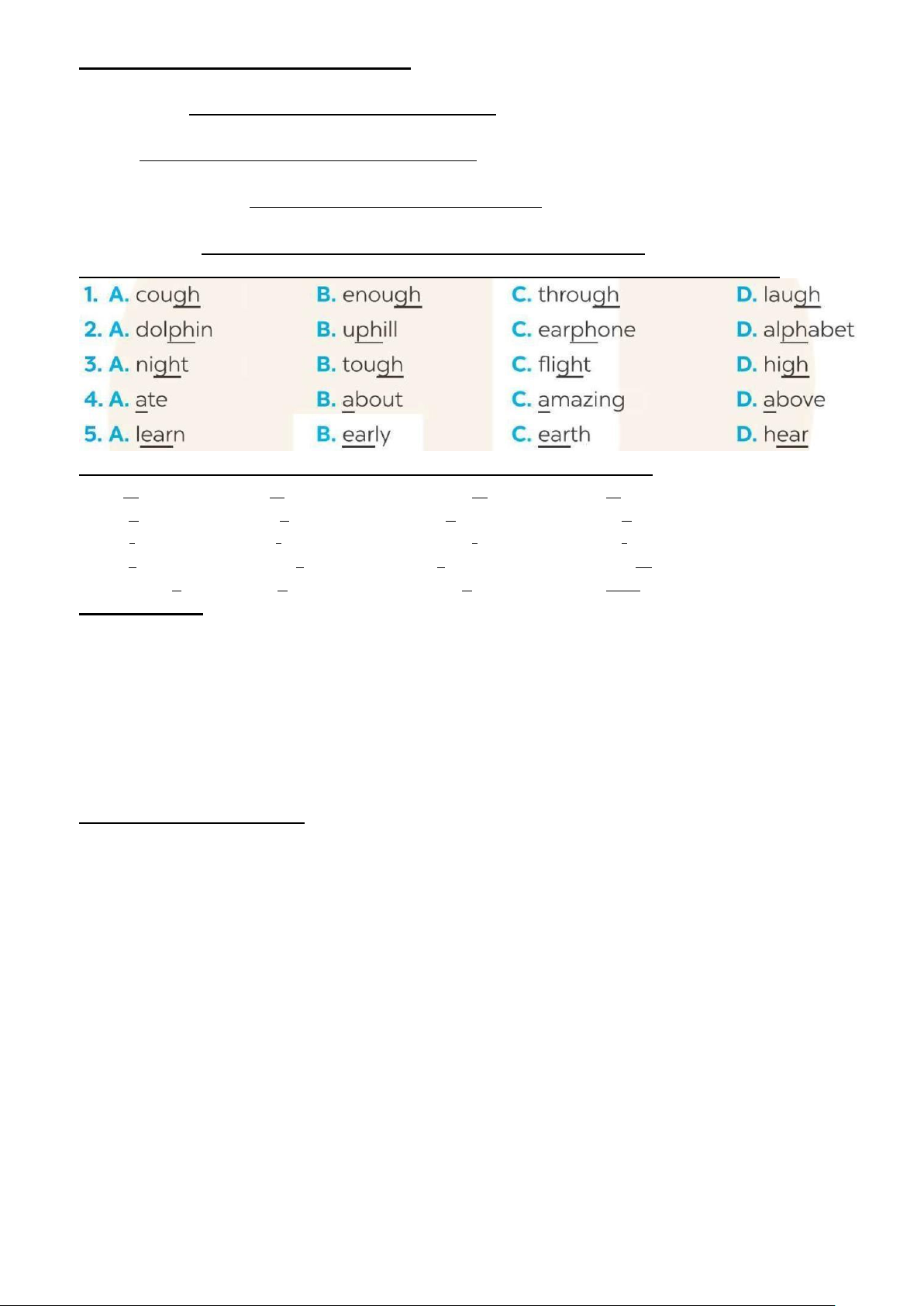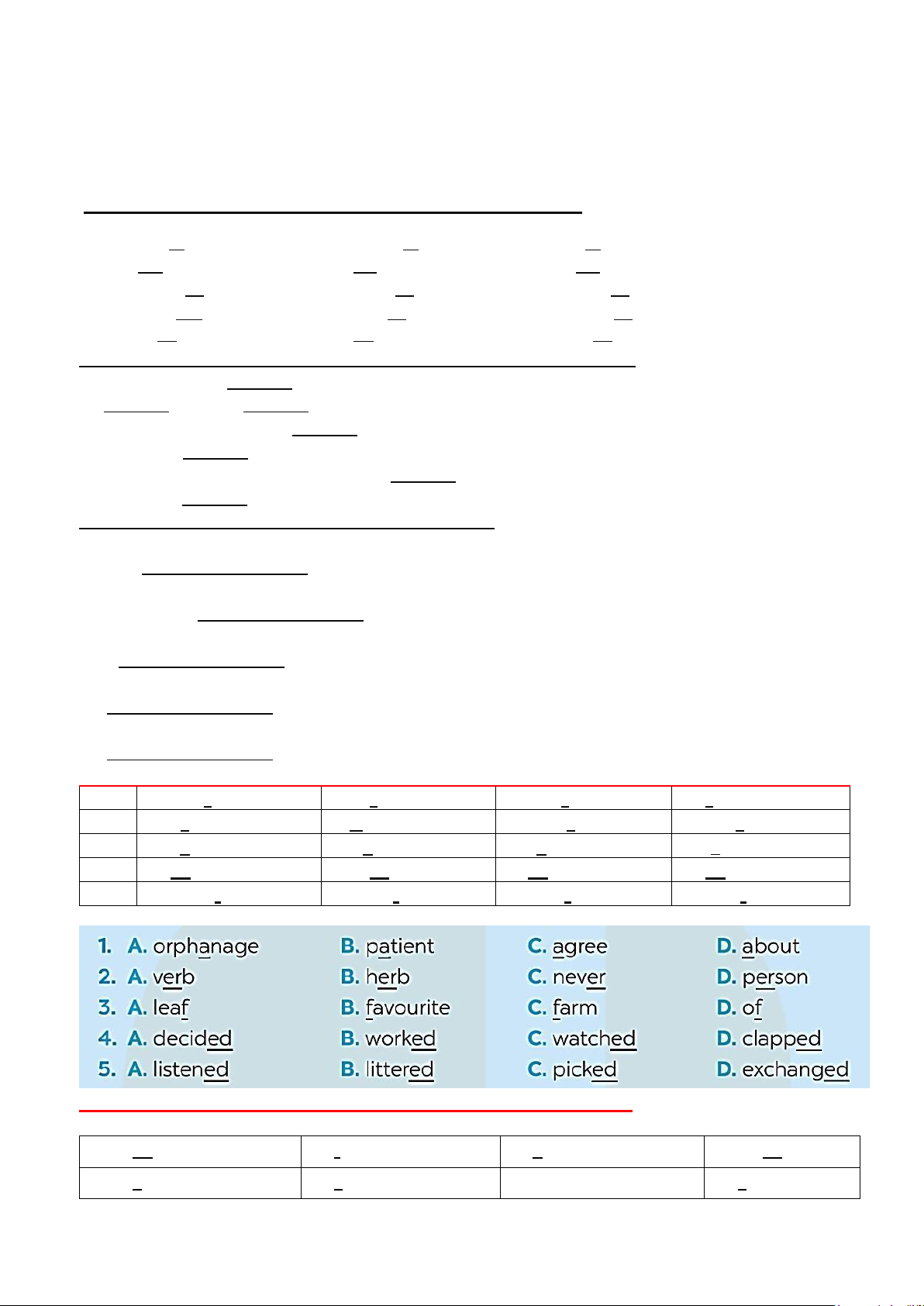 1. Khoanh tròn từ mà phần gạch chân được phát âm khác. 1. A. proverb B. together C. exercise 2. A. learn B. earn C. hear 3. A. collected B. cleaned C. donated 4. A. listened B. helped C. watched 5. A. laugh B. ghost C. rough