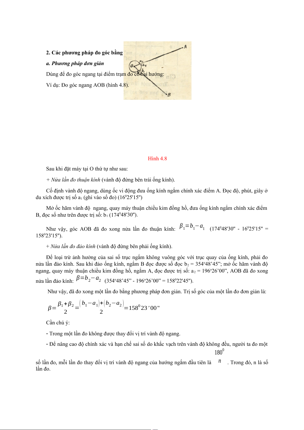 Như vậy, đã đo xong một lần đo bằng phương pháp đơn giản. Trị số góc của một lần đo đơn giản là: β + β