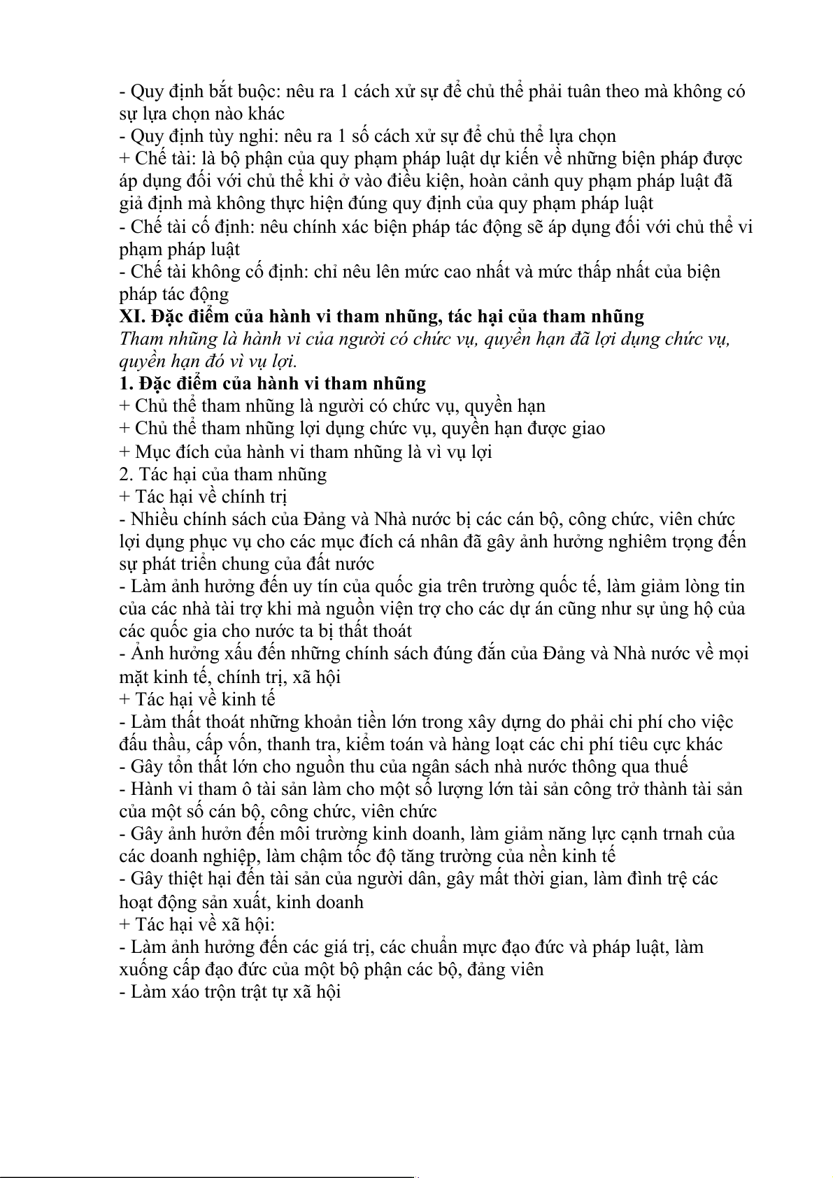 XI. Đặc điểm của hành vi tham nhũng, tác hại của tham nhũng