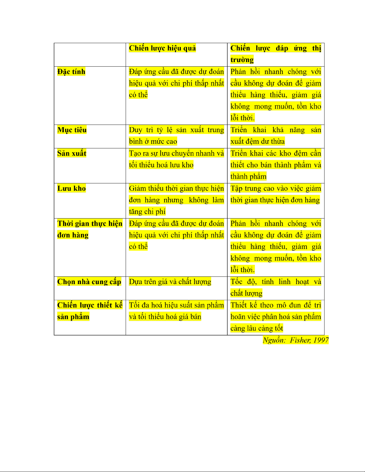 Theo Fisher (1997), các chuỗi cung ứng hỗ trợ hai loại sản phẩm chính là sản phẩm thông thường và sản phẩm đổi mới với các đặc tính nhu cầu khác nhau. Dựa trên đặc tính cầu của sản phẩm, Fisher đưa ra hai chiến lược chuỗi cung ứng phù hợp với hai loại sản phẩm này, là chiến lược hiệu quả và chiến lược đáp ứng thị trường.
