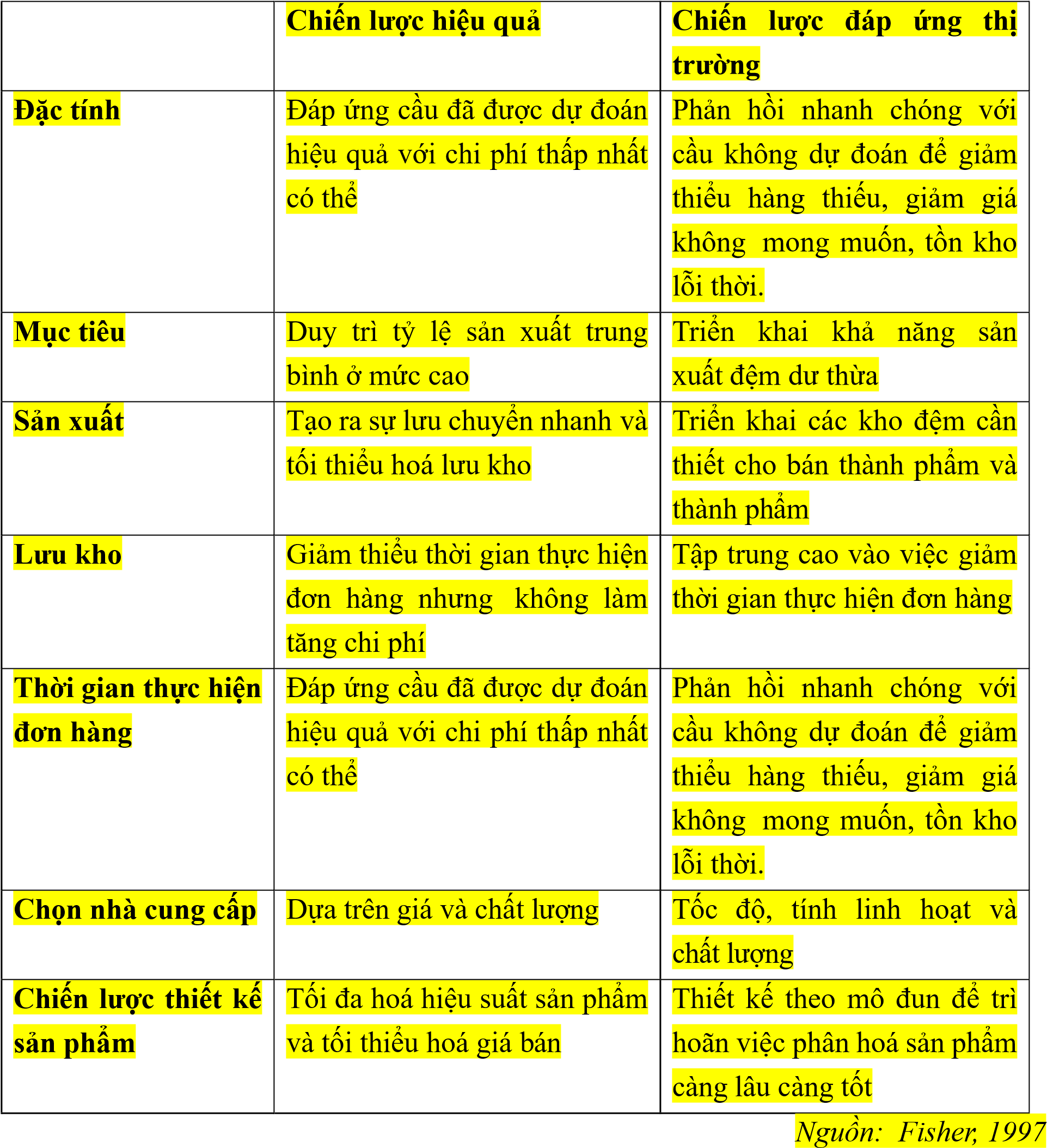 Bảng 3.2 Đặc tính chiến lược chuỗi cung ứng hiệu quả và chuỗi cung ứng đáp ứng thị trường