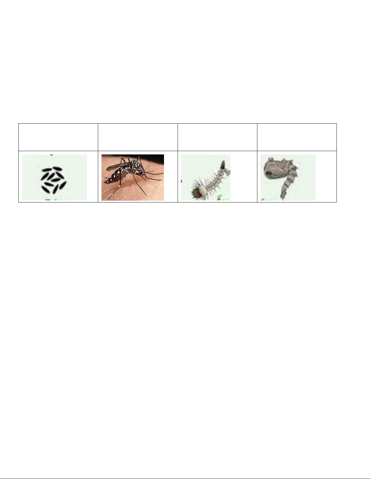 khu dân cư. Các hình bên dưới mô tả các giai đoạn trong vòng đời của loài muỗi vằn (được sắp xếp ngâu nhiên). (1) (2) (3) (4) Trứng Muỗi trưởng thành Ấu trùng Nhộng