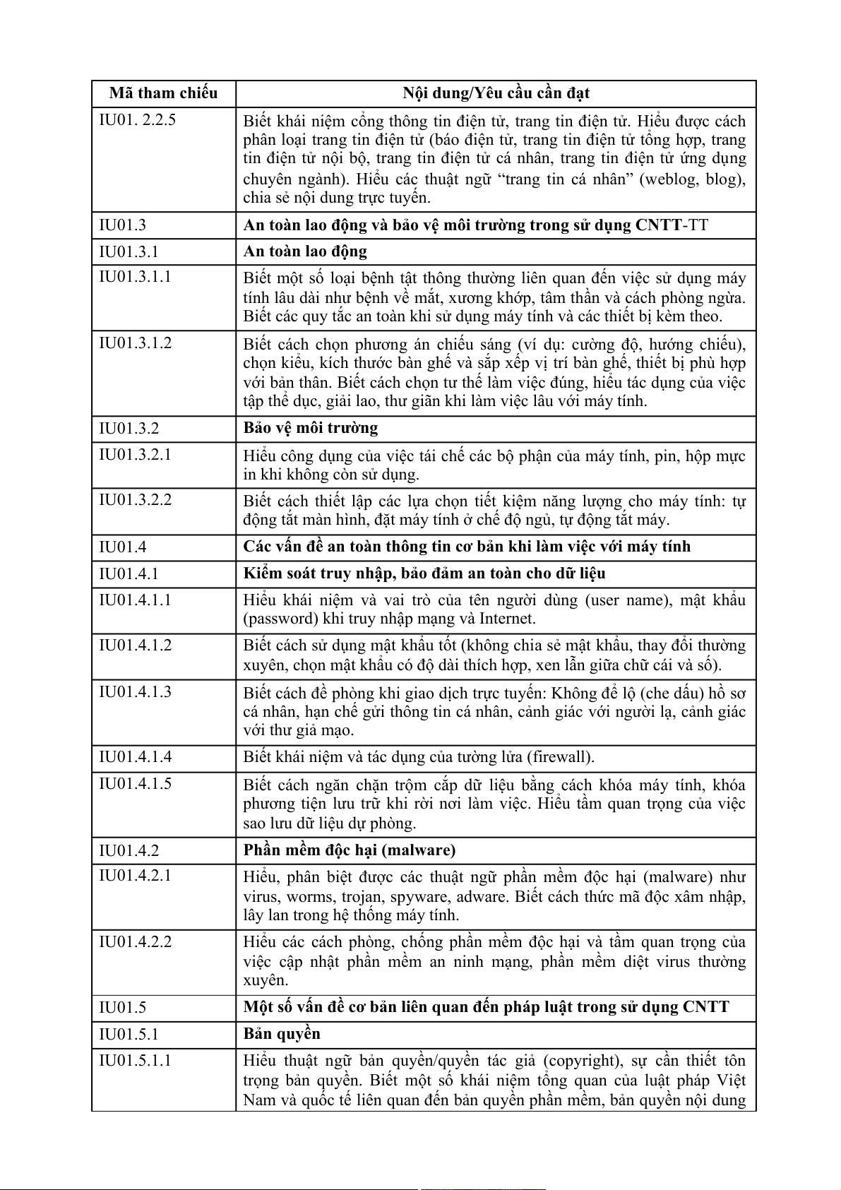 Nội dung/Yêu cầu cần đạt IU01.1