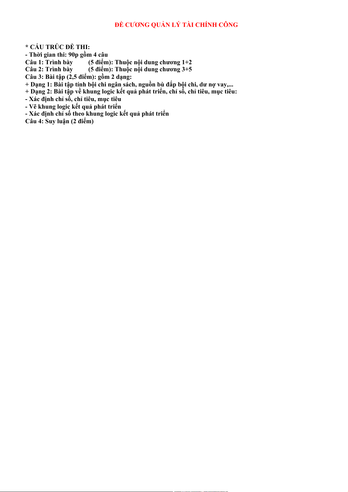 ĐỀ CƯƠNG QUẢN LÝ TÀI CHÍNH CÔNG * CẤU TRÚC ĐỀ THI: