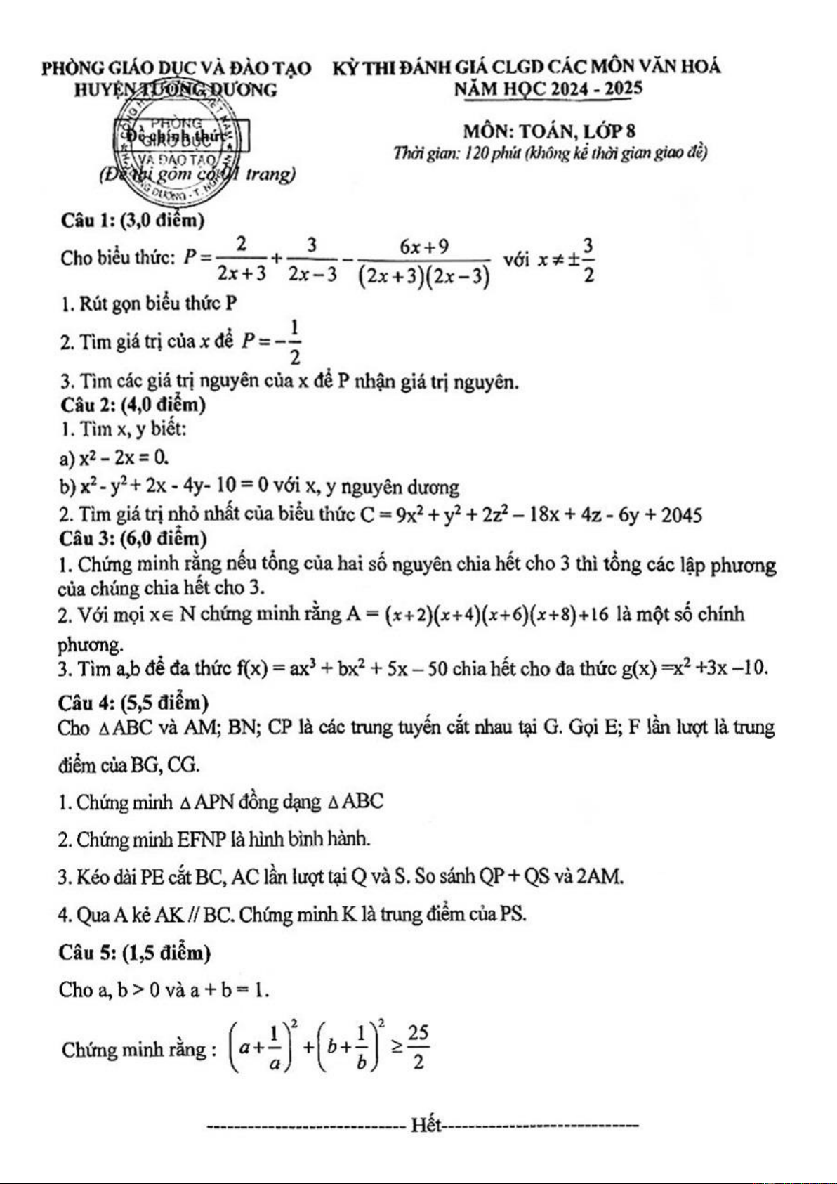 Giới thiệu đến quý thầy, cô giáo và các em học sinh lớp 8 đề thi đánh giá chất lượng giáo dục môn Toán 8 n ăm học 2024 – 2025 phòng Giáo dục và Đào tạo huyện Tương Dương, tỉnh Nghệ An. Đề thi gồm 01 trang, hình thức tự luận với 05 bài toán, thời gian làm bài 120 phút.
