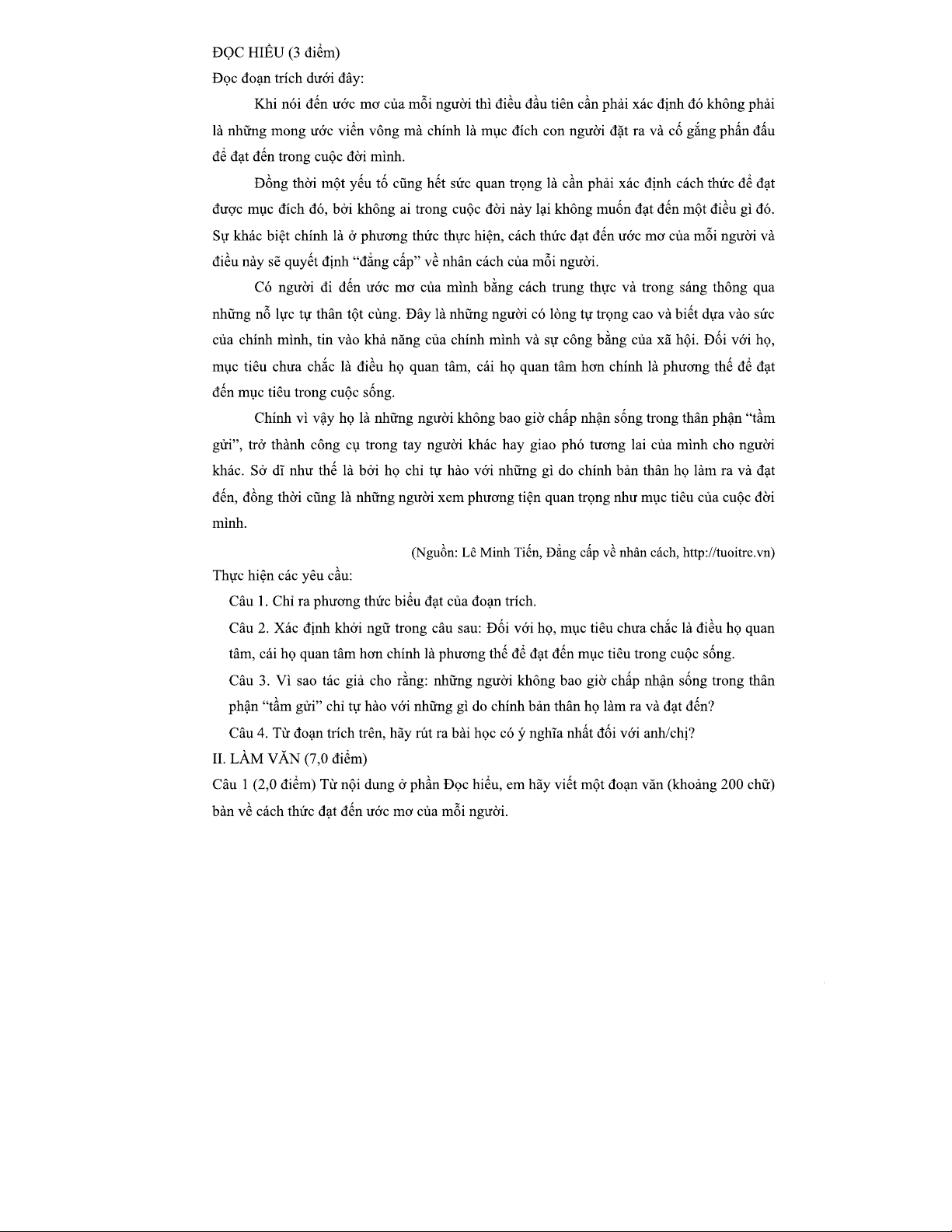 ĐỀ ĐỌC HIỂU VÀ PHÂN TÍCH CÁCH THỨC ĐẠT ĐẾN ƯỚC MƠ