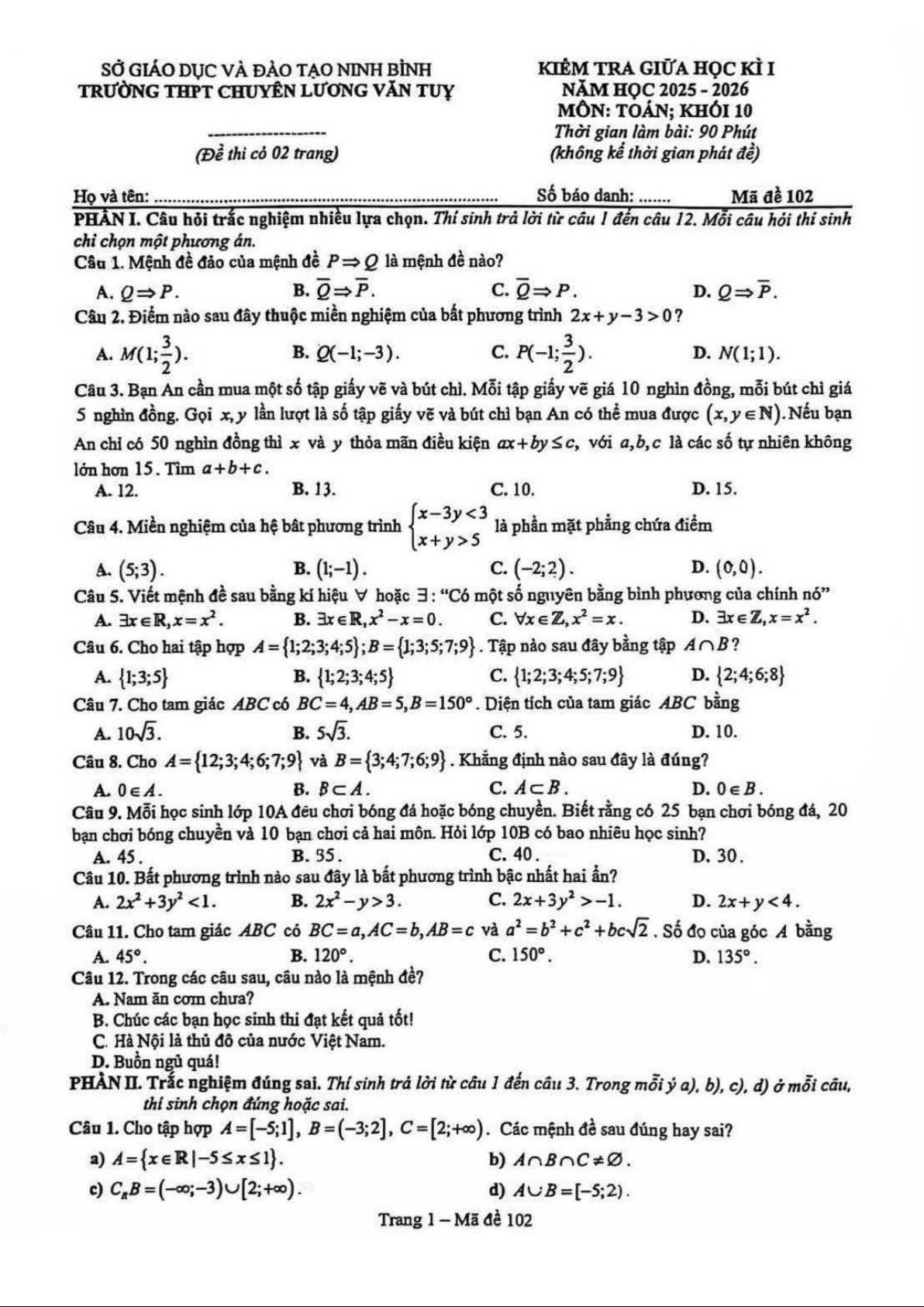 Đề giữa học kì 1 Toán 10 năm 2025 – 2026 trường chuyên Lương Văn Tụy – Ninh Bình